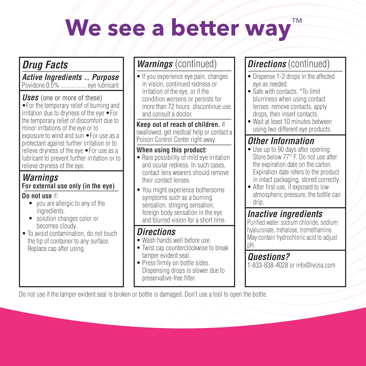 Your Dry Eyes Deserve Better. From The Makers Of Similasan, Ivizia Sterile Lubricant Eye Drops For Dry Eyes Is Scientifically Formulated To Relieve Dryness, Discomfort, And Eye Strain Due To Dryness. Made With Hydrating Polymers That Form A Protective Matrix Over Your Eyes, Moisturizing Hyaluronic Acid, And Revitalizing Trehalose Our Drops Give You The Relief You Need From Dry Eye Symptoms. Ivizia Is Preservative-Free, Can Be Used With Contact Lenses, And Can Be Used Pre Or Post-Surgery. Ivizia – We See A Better Way. To Limit Bluriness With Contact Lenses, You Can Remove Them Before Applying The Drops