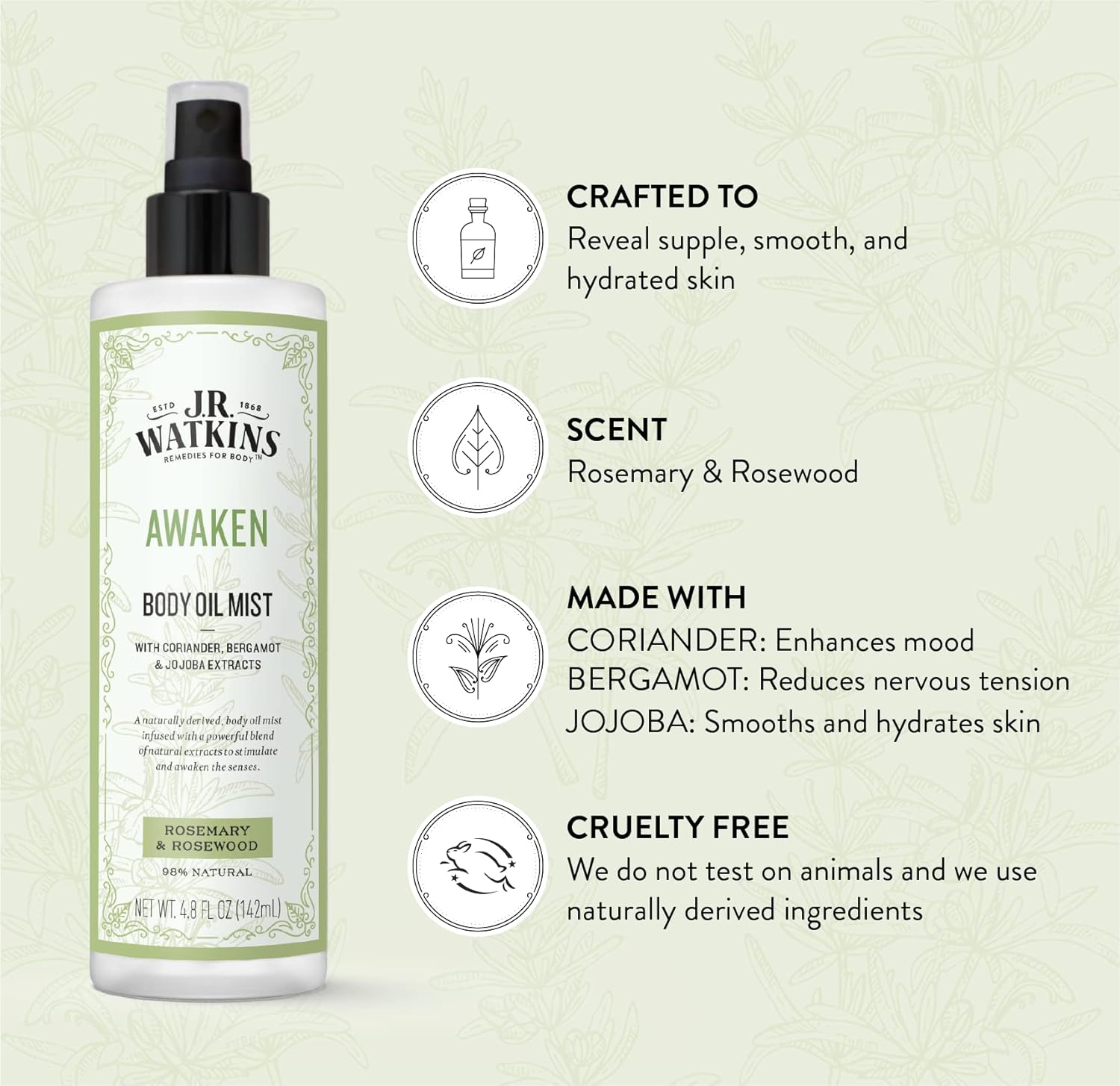 About this item Hydrating Body Oil Mist: J.R. Watkins AWAKEN Body Oil Mist reveals supple, smooth, and hydrated skin while encouraging a restful night's sleep. Rosemary & Rosewood Scent: AWAKEN Body Oil Mist is crafted to awaken the senses after a night of peaceful slumber. Bright Bergamot dances with a spice medley of Cardamom, Rosemary, Turmeric, and Pepper. Beautiful Rosewood and light Musk ground the fragrance to allow your body to experience a burst of energy. Top Notes: Bergamot, Neroli, Fig Fruit, and Cardamom. Middle Notes: Rosemary, Rose, Turmeric, Green, and Peppercorn. Bottom Notes: Coconut, Cedarwood, and Musk. Enhance Your Mood & Skin With These Key Ingredients: Coriander enhances mood, Bergamot reduces nervous tension, and Jojoba smooths and hydrates skin. Crafted Clean: All J.R. Watkins products are cruelty-free, paraben-free, silicon-free, and sulfate-free. From J.R. Watkins: Since 1868, we have been delivering potent, plant-based home and body remedies that not only soothe, but solve. See more product details,Hydrating Body Oil Mist: J.R. Watkins AWAKEN Body Oil Mist reveals supple, smooth, and hydrated skin while encouraging a restful night's sleep,Rosemary & Rosewood Scent: AWAKEN Body Oil Mist is crafted to awaken the senses after a night of peaceful slumber. Bright Bergamot dances with a spice medley of Cardamom, Rosemary, Turmeric, and Pepper. Beautiful Rosewood and light Musk ground the fragrance to allow your body to experience a burst of energy. Top Notes: Bergamot, Neroli, Fig Fruit, and Cardamom. Middle Notes: Rosemary, Rose, Turmeric, Green, and Peppercorn. Bottom Notes: Coconut, Cedarwood, and Musk,Enhance Your Mood & Skin With These Key Ingredients: Coriander enhances mood, Bergamot reduces nervous tension, and Jojoba smooths and hydrates skin,Crafted Clean: All J.R. Watkins products are cruelty-free, paraben-free, silicon-free, and sulfate-free,From J.R. Watkins: Since 1868, we have been delivering potent, plant-based home and body remedies that not only soothe, but solve