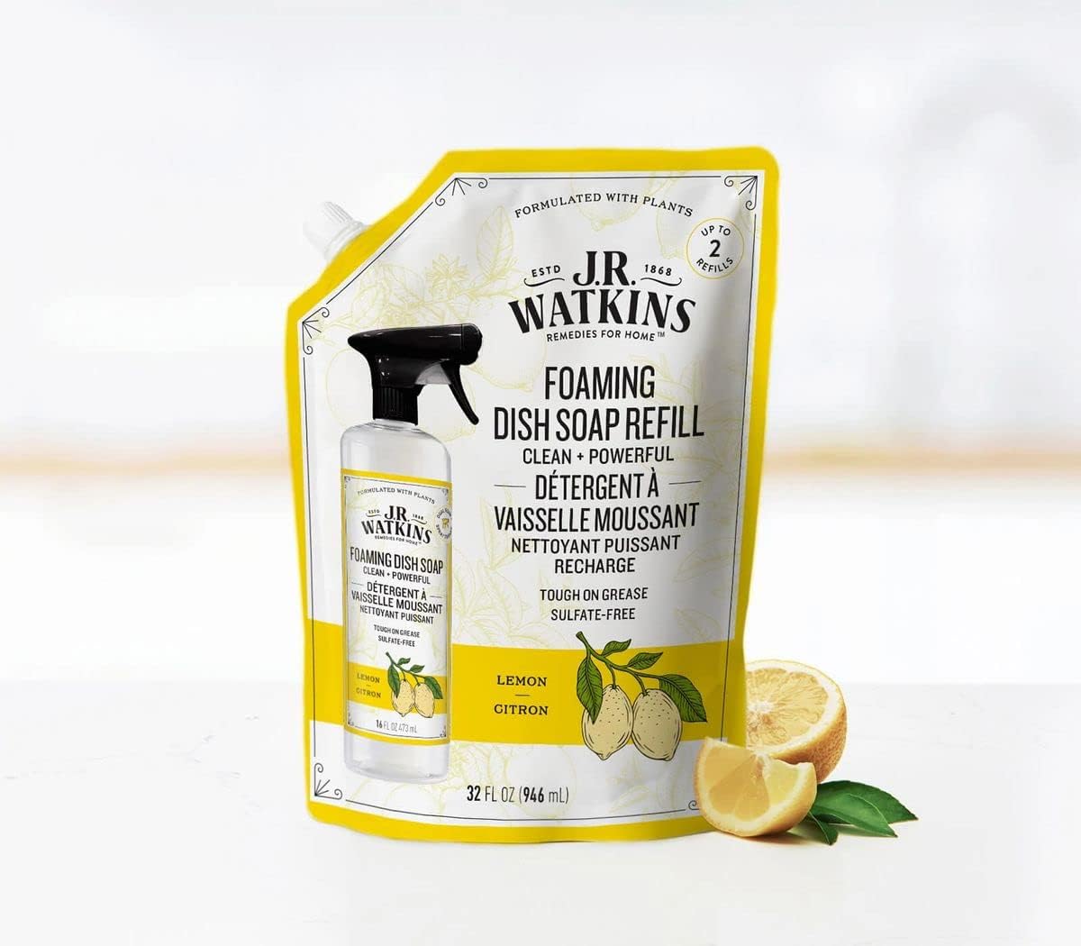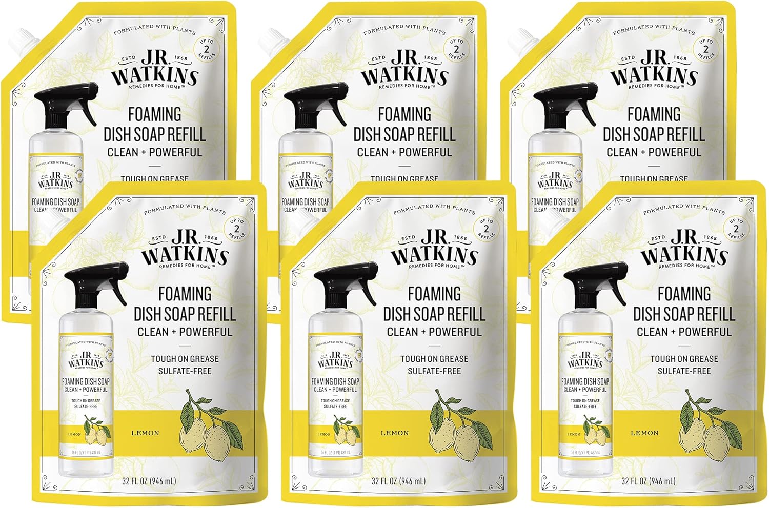 J.R. Watkins Foaming Dish Soap Refill Pouch, Crafted Clean & Cruelty Free, Lemon, 32 Fl Oz, 6 Pack