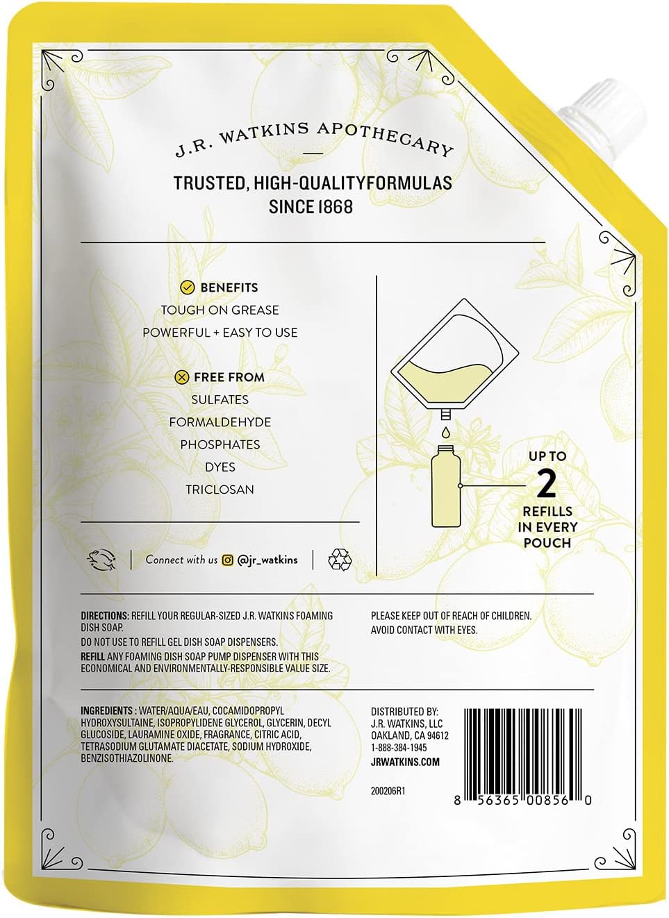 GREAT VALUE: Have your favorite J.R Watkins foaming dish soap always available with this refill pouch pack; enough to fill your regular bottle up to 2 times. Just remove the cap from your dish soap bottle and pour in until filled