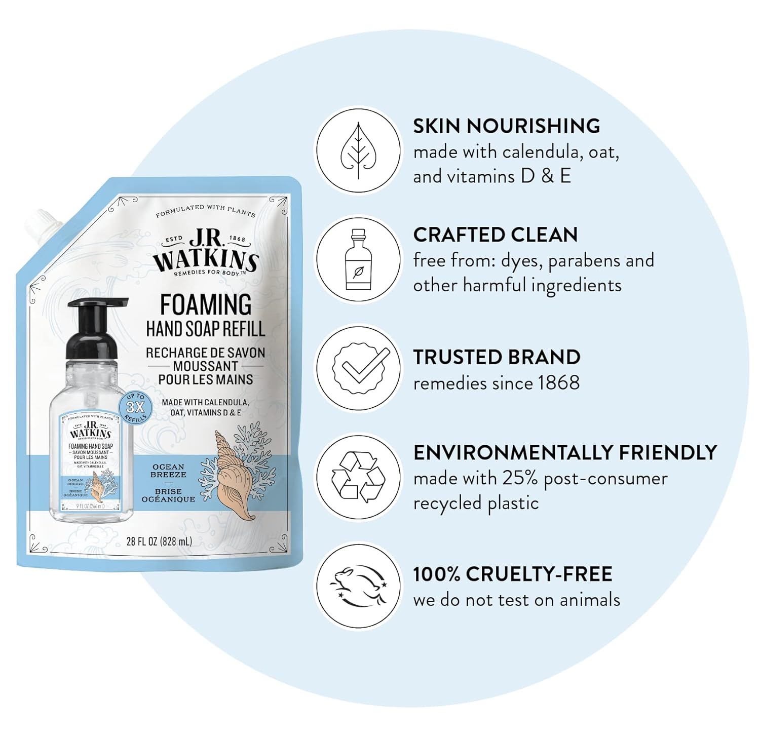 J.R. Watkins Foaming Hand Soap Refill, Moisturizing Foam Hand Wash, All Natural, Alcohol-Free, Cruelty-Free, Usa Made, Ocean Breeze, 28 Fl Oz, 3 Pack
