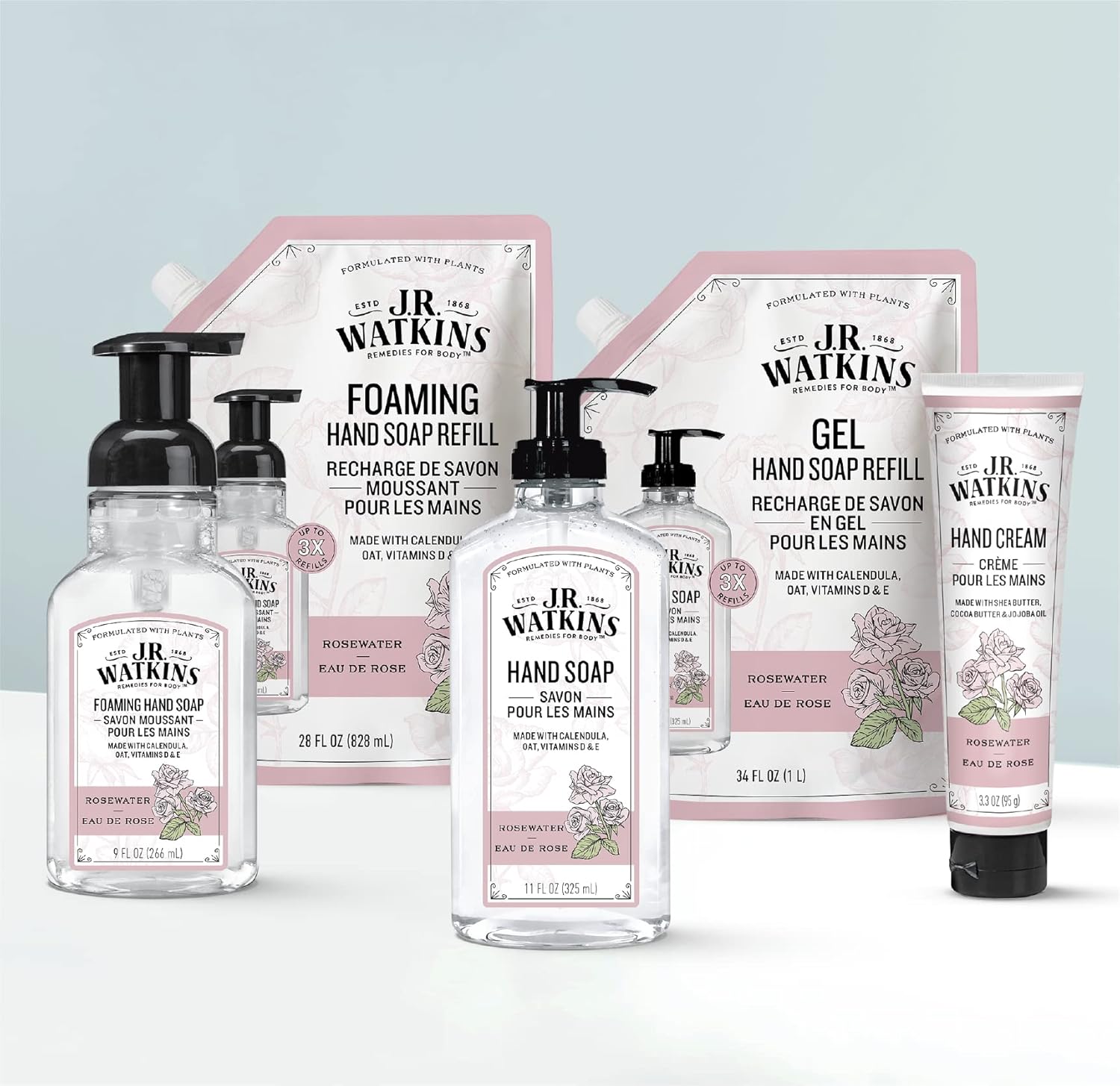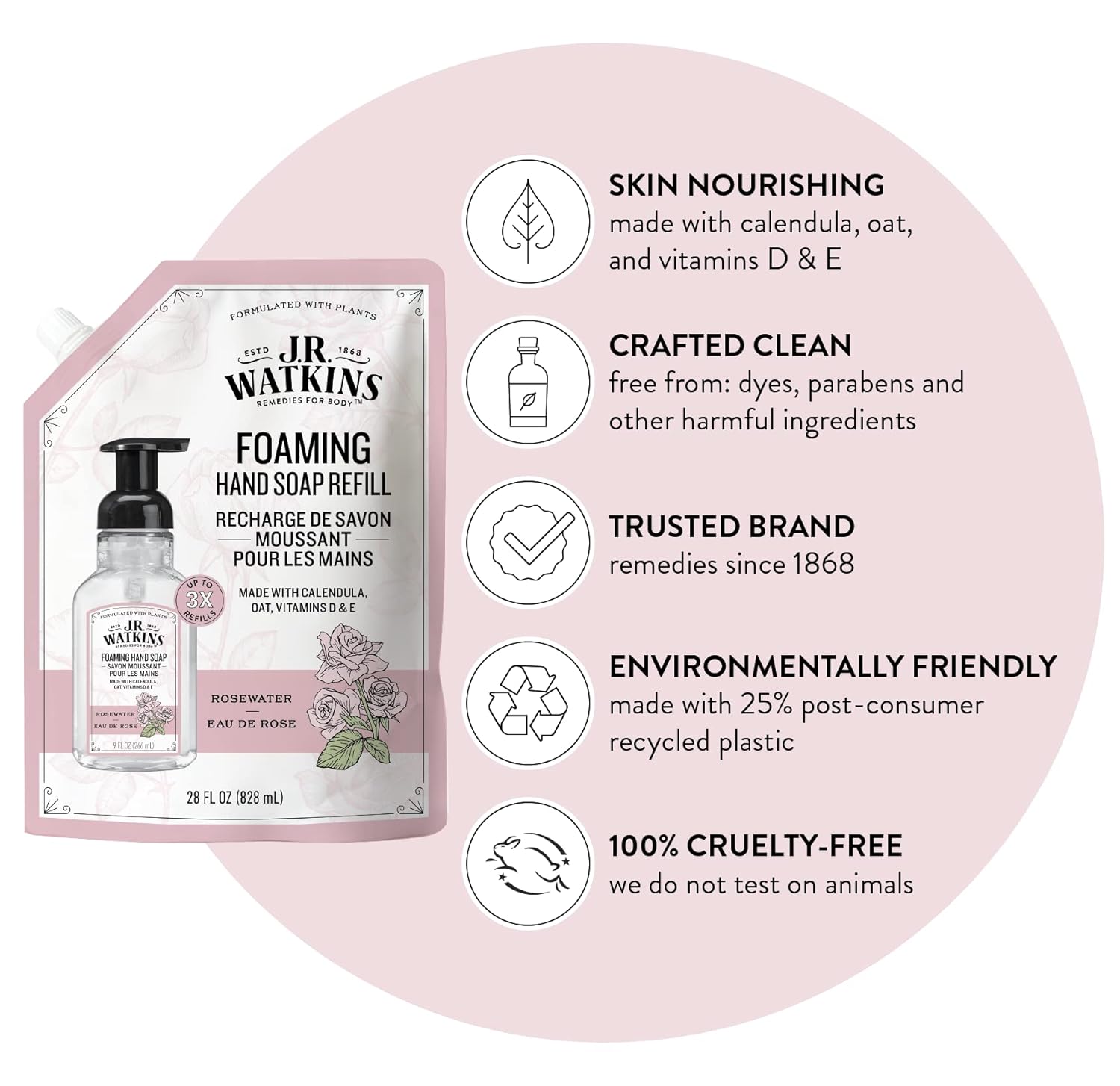 J.R. Watkins Foaming Hand Soap Refills, All Natural, Alcohol-Free Hand Wash, Cruelty-Free, Usa Made, Moisturizing Hand Soap Refill For Bathroom Or Kitchen, Rosewater, 28 Fl Oz Foam Soap Refill, 3 Pack