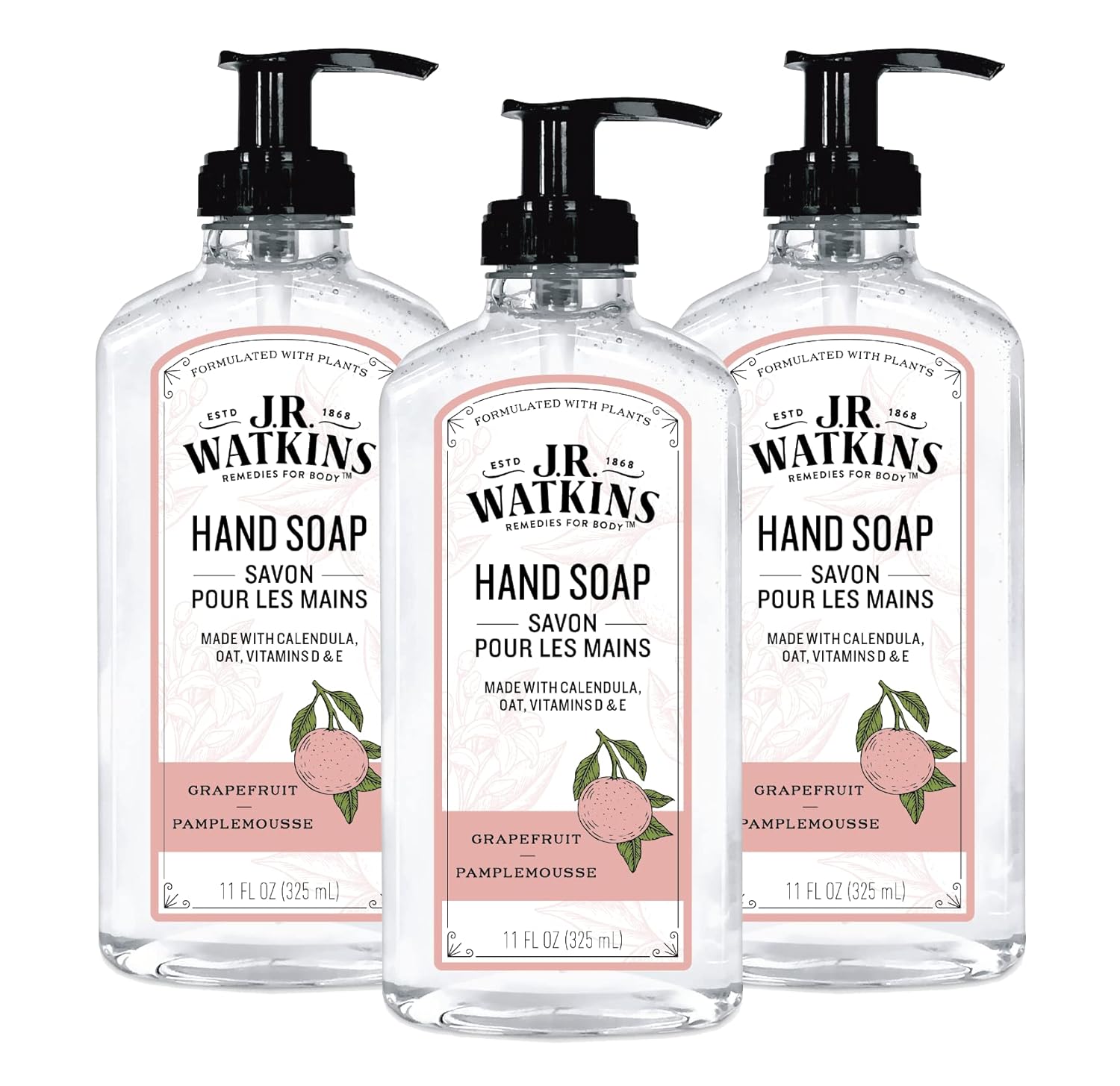 J.R. Watkins Gel Hand Soap For Bathroom Or Kitchen, Scented, Usa Made And Cruelty Free, 11 Fl Oz, Grapefruit, 3 Pack