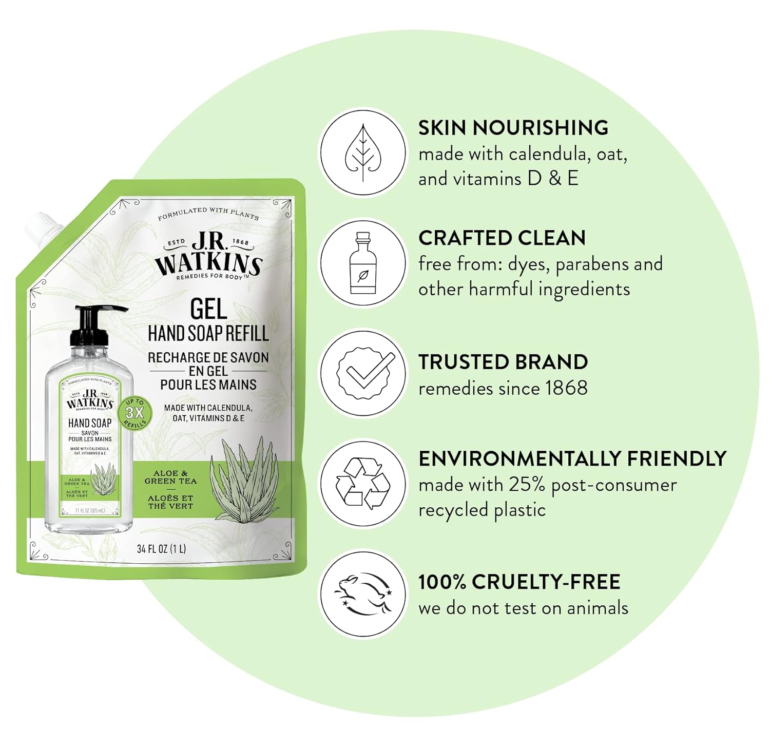 J.R. Watkins Gel Hand Soap Refill, Moisturizing Hand Wash, All Natural, Alcohol-Free, Cruelty-Free, Usa Made, Aloe Green Tea, 34 Fl Oz, 3 Pack