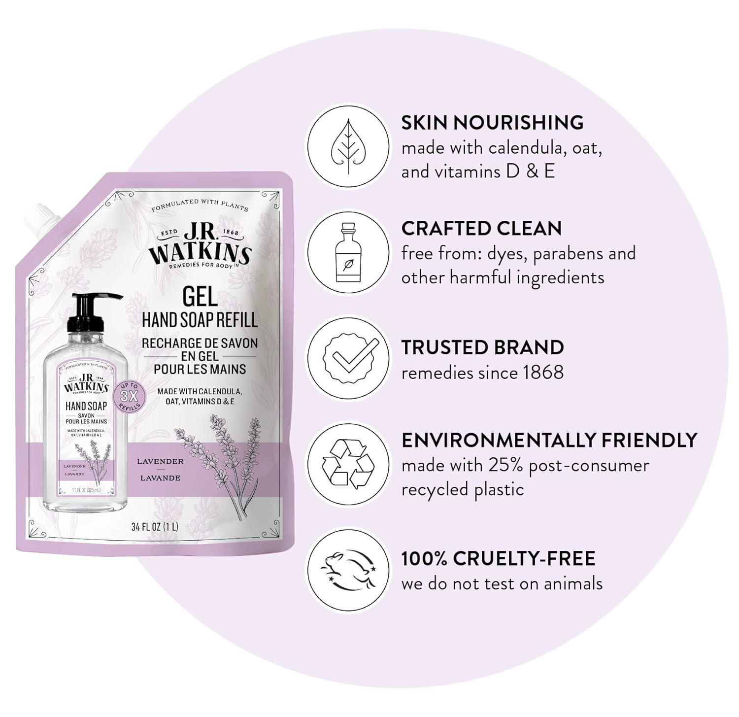 J.R. Watkins Gel Hand Soap Refill, Moisturizing Hand Wash, All Natural, Alcohol-Free, Cruelty-Free, Usa Made, Lavender, 34 Fl Oz (Pack Of 3)