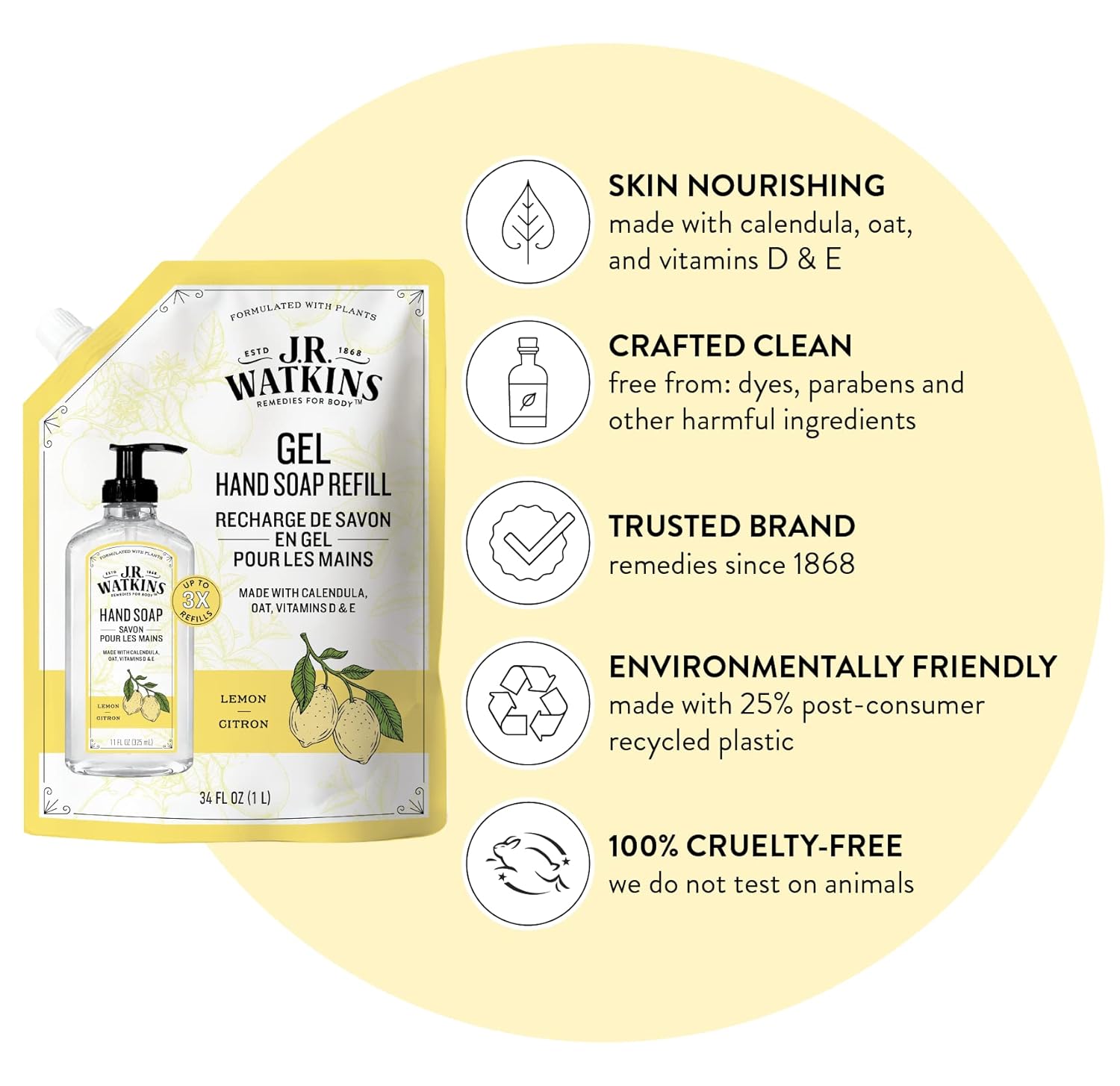 J.R. Watkins Gel Hand Soap Refill, Moisturizing Hand Wash, All Natural, Alcohol-Free, Cruelty-Free, Usa Made, Lemon, 34 Fl Oz, 3 Pack