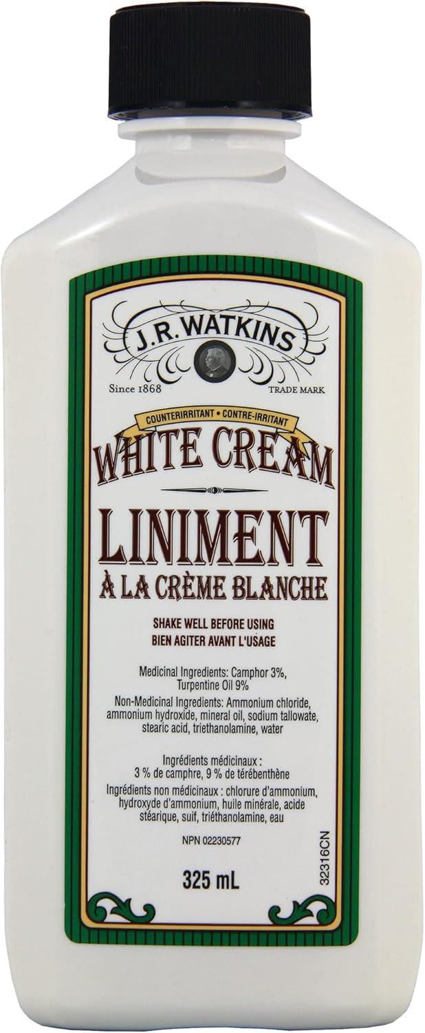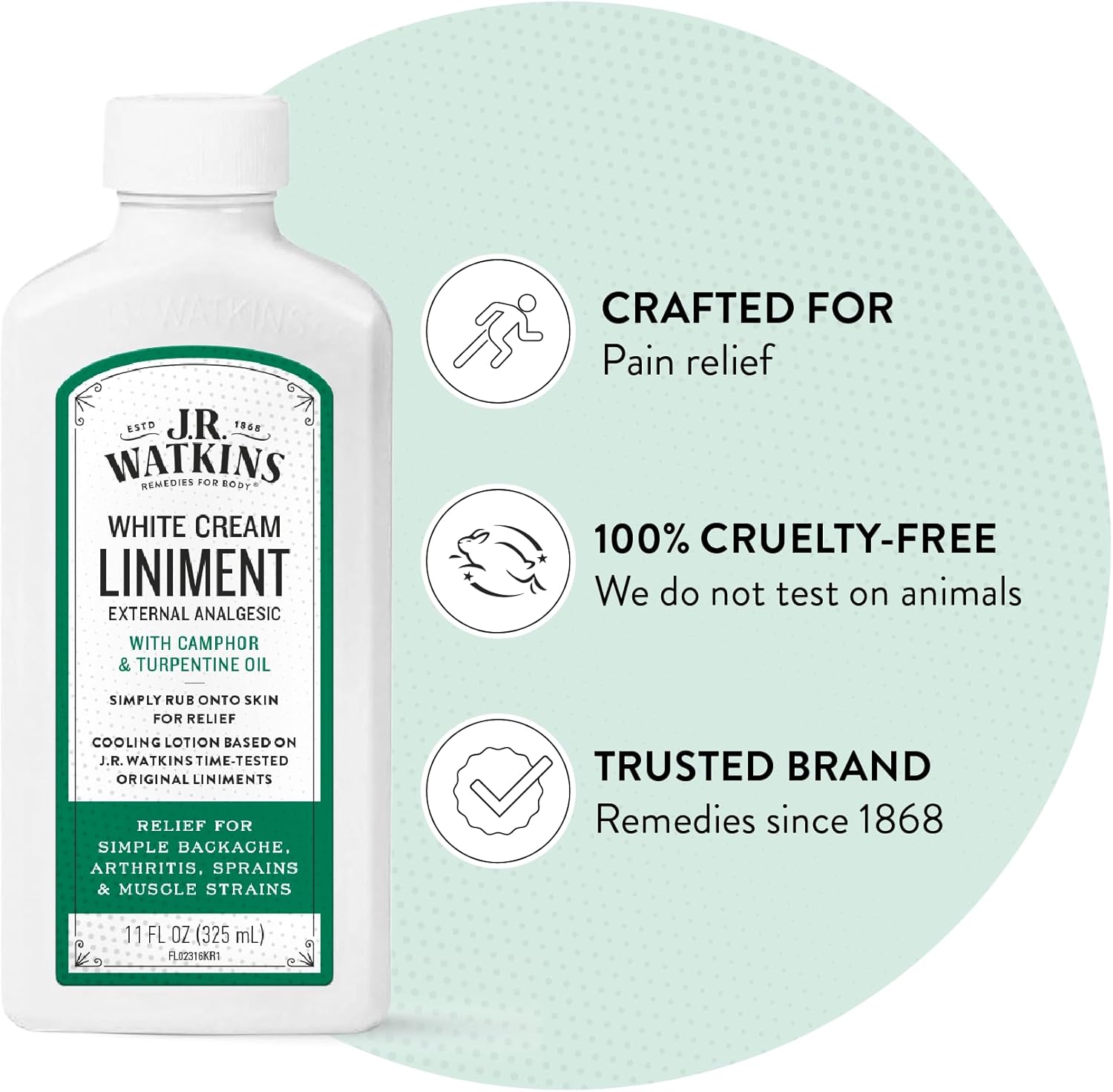 For Temporary Pain Relief J. R. Watkins White Cream Liniment is a pain relief application that can give relief in soreness due to exertion and arthritis pain. The application has camphor and turpentine oil as its active ingredients that are responsible for pain relief. This application is based on old fashioned remedy and can relieve pain quickly.Gentle on skinInstant reliefMade in the USAThis Liniment is a natural pain reliever to get rid of minor aches and pain. Just For You: Adults A Closer Look: J. R. Watkins White Cream Liniment uses evergreen based counter-irritants to provide relief from pain in the muscles and joints. The active compounds get active on rubbing and penetrate through the skin. The relief is temporary and is effective for muscular pain and sprains. The application can be absorbed easily and can keep the skin free of dryness. Warning: Meant for external application. Do not use on cracked skin,Contains 1 - 11 Ounce bottle,Also relieves pain of tendons and ligaments, tired or aching muscles and overexertion,Cooling camphor lotion based on Watkins time-tested original red liniment