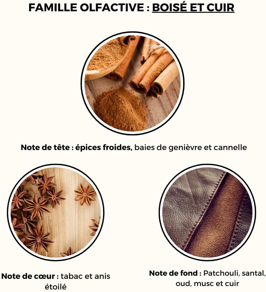 This woody spicy fragrance has a blend of lemon, bergamot, cardamom, cinnamon, nutmeg, juniper, and musk