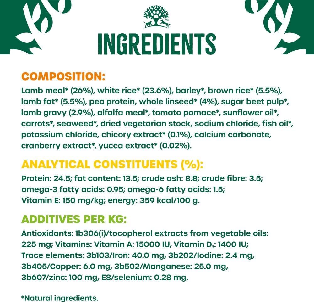 Lamb meal – A delicious source of protein with essential minerals brown and white rice a highly digestible carbohydrate, linseed a great source of omega 3