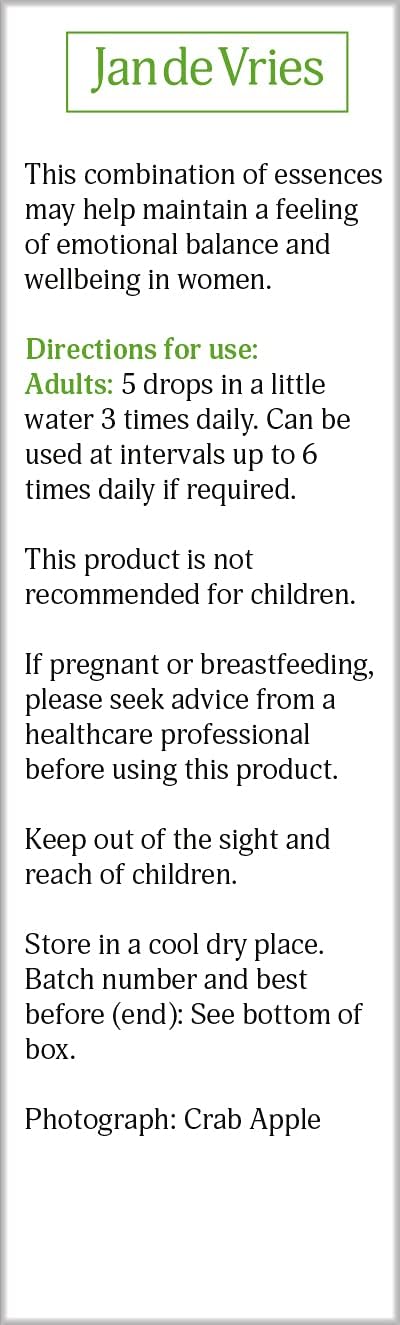DESCRIPTION : Jan De Vries Female Essence | Flower Essence | Soothe Irritable Moods | Contains Olive, Crab Apple & Pomegranate | 30ml