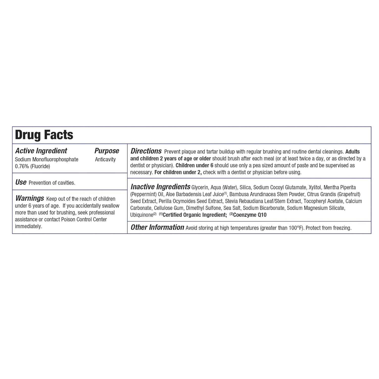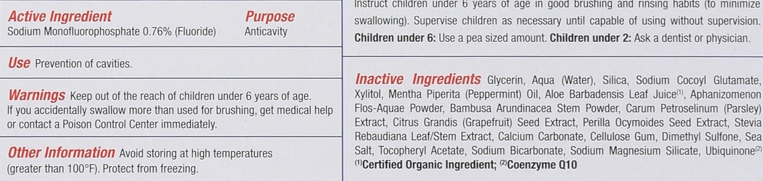 Free of fluoride, gluten, saccharin, artificial sweeteners, parabens, propylene glycol and SLS