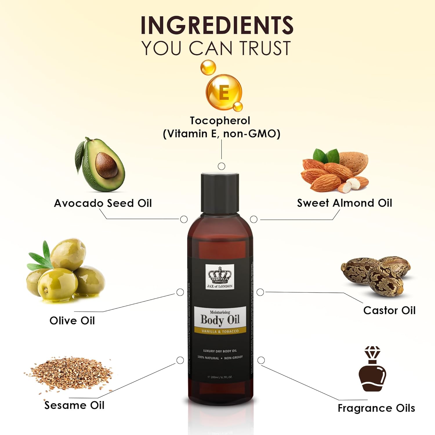 About The Product : ???????????????? ?????????? ???? ????????: Jax of London Vanilla & Tobacco body oil for women is crafted with the most fragrant, natural essential oils (avocado, sesame, olive), enriched with omega 3, 6 and 9 fatty acids for excellent results