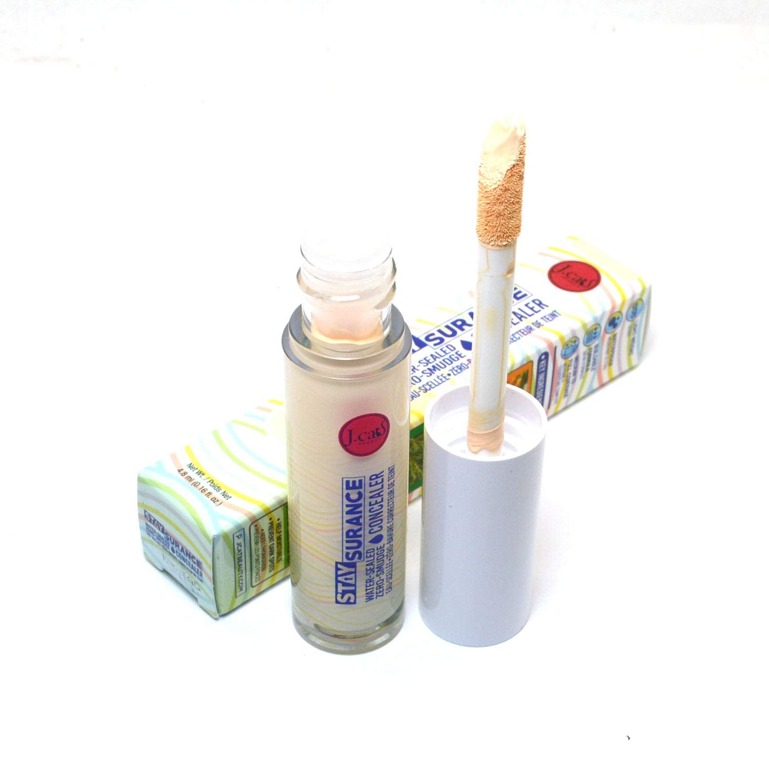 A light-weight, yet, long lasting concealer that combats dark circles, redness, and any imperfection for a flawless look. + LIGHT-WEIGHT, + WATERPROOF, + BUILDABLE FORMULA, + MEDIUM TO FULL COVERAGE Recomended shade match with foundation & Concealer : Skin surance max coverage silky foundation+ Stay surance water-sealed zero-smudge concealer HOW TO USE + Apply and dab on the areas of any areas of any imperfection. + Blend it with J.Cat Beauty Small Shader Brush (BR1) PRO TIP + Apply Staysurance Water-SealedZero-Smudge Concealer before aquasurance compact foundation. + To brighten under the eyes, select two shades lighter than the concealer shade and blend. KEY INGREDIENTS PEACH LEAF EXTRACT, PROTECT & REPAIR SKIN, ANTI-AGING PROPERITY, TEA TREE LEAD EXTRACT, HELPS TREAT ACNE RED, CE UNDER-EYE DARK CIRCLES, ALOE VERA LEAF EXTRACT, HELP MOISTURIZE, PREVENT DARK SPOTS INGREDIENTS Water, Cyclopentasiloxane, Titanium Dioxide, Butylene Glycol, PVP, Phenyl Trimethicone, Cetyl PEG/PPG-10/1 Dimethicone, Vinyl Dimethicone/Methicone Silsesquioxane Crosspolymer, PEG-10 Dimethicone, Disteardimonium Hectorite, Dimethicone, Polyglycerl-3 Diisostearate, Sodium Chloride, CI 77492, 1,2-Hexanediol, Phenoxyethanol, Caprylyl Glycol, Talc, CI 77491, Triethoxycaprylylsilane, Tocopheryl Acetate, Prunus Persica (Peach) Leaf Extract, Melaleuca Alternifolia (Tea Tree) Leaf Extract, Aloe Vera Leaf Extract