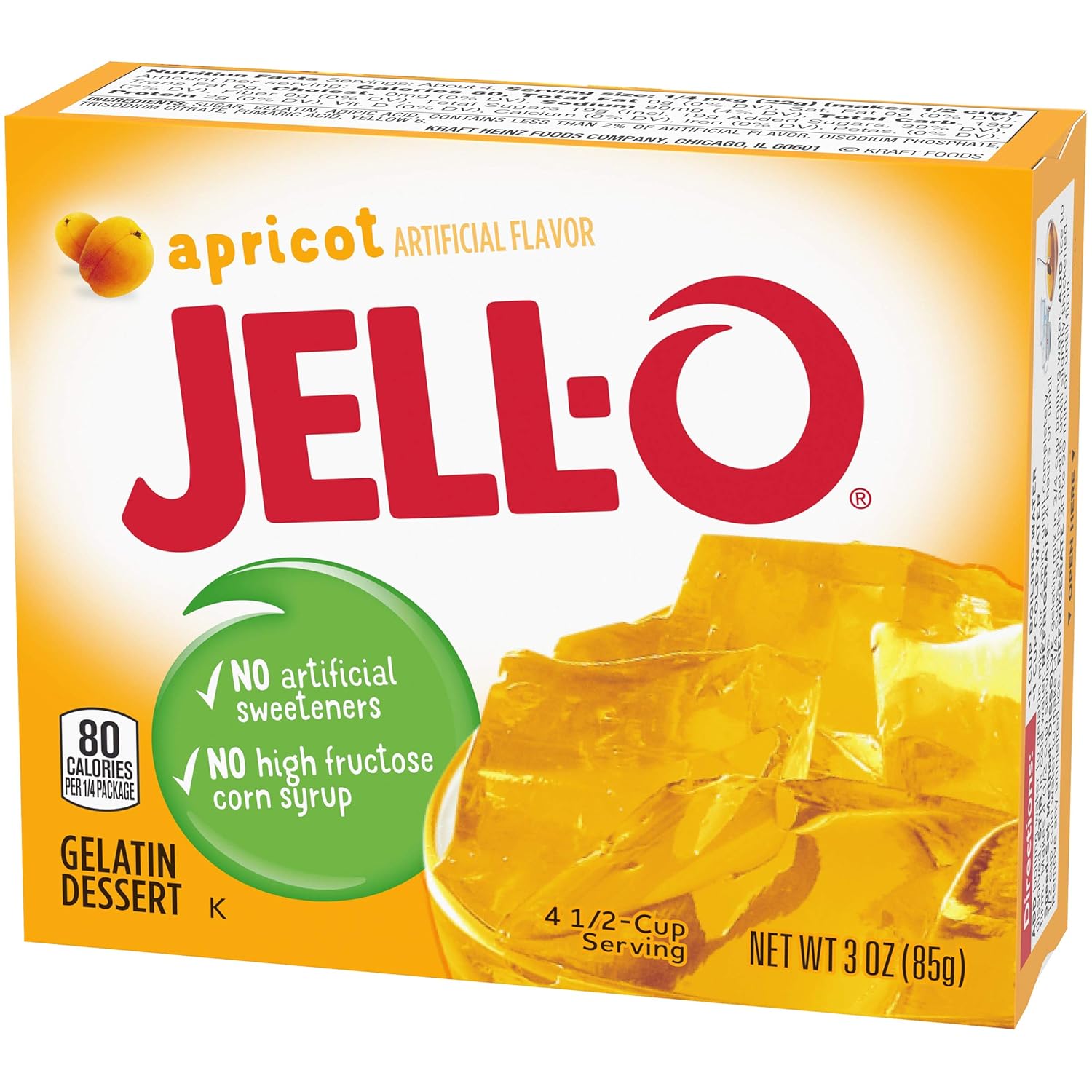 Jell-O Apricot Instant Gelatin Mix Is An Easy To Make Apricot Flavored Dessert. With No Artificial Sweeteners And No High Fructose Corn Syrup And Fat Free, This Dessert Is One You Can Feel Good About Sharing With Your Family. This 3 Ounce Package Makes Four 1/2-Cup Servings So You Can Prepare Enough For The Whole Family. It'S Easy To Make A Tasty Dessert For Kids Or Adults. Simply Mix The Gelatin With Boiling Water, Stir In Cold Water, And Refrigerate Until Set