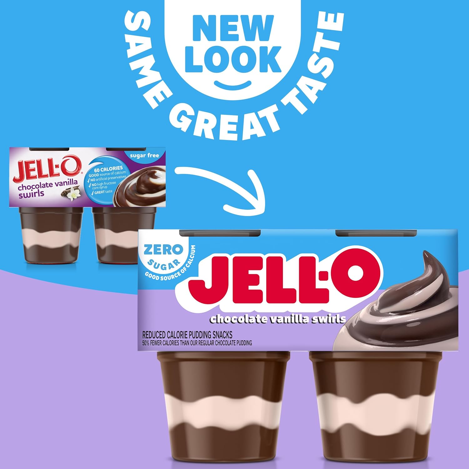 Jello Chocolate Vanilla Swirls Sugar Free Refrigerated Pudding Cups Snack Delivers The Great Taste Of Jello Pudding In A Reduced-Calorie Option. Our Delicious On-The-Go Sugar Free Pudding Comes In Individual Cups, Perfect For Lunch Snacks Or After School Snacks. Jello Creamy Swirled Chocolate And Vanilla Pudding Contains 60 Calories Per Serving And 50% Fewer Calories Than Regular Jello Chocolate Pudding. Every Zero Sugar Pudding Cup Is Made Without Artificial Preservatives And Contains No High-Fructose Corn Syrup. Each 14.5-Ounce Sleeve Contains Four Jello Pudding Cups For Quick And Easy Snacking