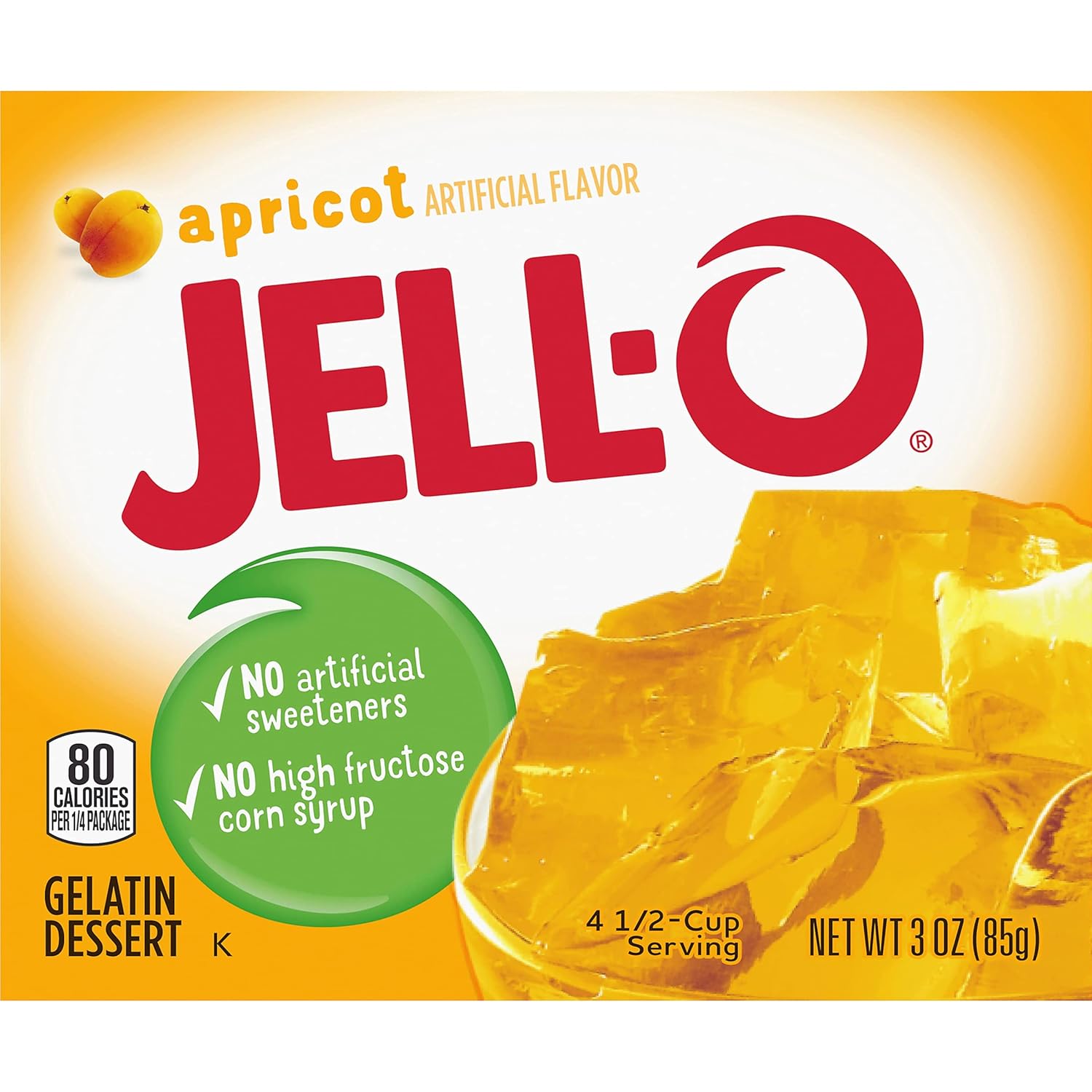 Jell-O, Gelatin Dessert, Apricot. Refreshing Apricot Taste, Only 80 Calories Per Serving; Naturally Fat-Free, Makes A Delicious Dessert; Just Add Water And Allow To Set