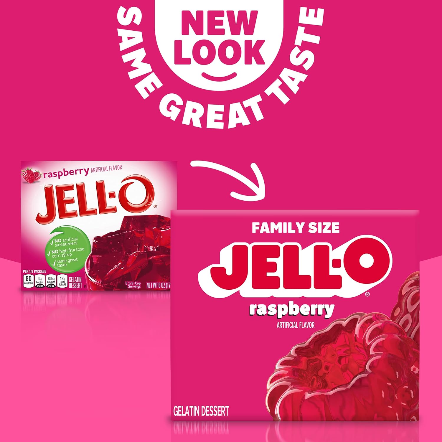Jell-O Raspberry Artificially Flavored Gelatin Dessert Mix Lets You Add Some Wonder To Your Day With A Delicious Snack. Spoon Up A Smile With Our Artificially Flavored Raspberry Jell-O Gelatin That Contains 80 Calories Per Serving. Our Colorful, Jiggly Treat Is Perfect For Everyday Snacking Or Special Occasions With Family And Friends. Additionally, Our Gelatin Dessert Mix Is A Versatile Ingredient For Creating Desserts Like Poke Cakes, Parfaits, Pretzel Salads, Rainbow Layer Cakes And More. Our Artificially Flavored Raspberry Gelatin Dessert Is Easy To Prepare. Simply Add 2 Cups Boiling Water To The Gelatin Mix, Stir For 2 Minutes Until Completely Dissolved, Stir In 2 Cups Cold Water, Then Refrigerate For 4 Hours Or Until Firm. Each Family Size Jell-O Gelatin Dessert Mix Is Individually Packaged In A 6-Ounce Sealed Pouch And Makes 8, 1/2-Cup Servings