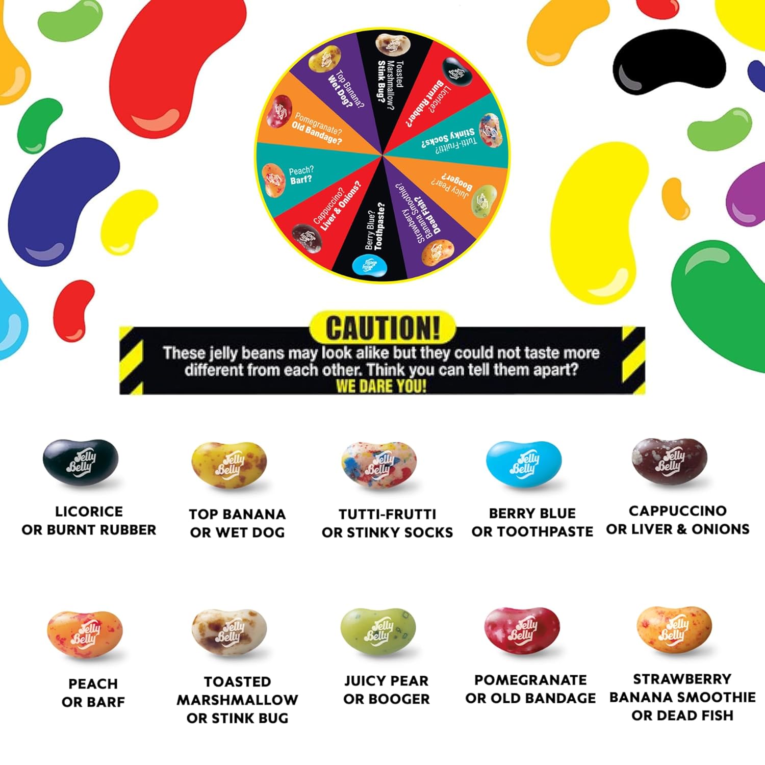 These Jelly Beans Go By Many Names... Including: Dare Jelly Beans, Nasty Jelly Beans, Bean Balooza, Gross Flavored Jelly Beans, Jelly Beans Spinner, Bad Jelly Beans, Jelly Bean Roulette, Jelly Belly Jelly Beans Beanboozled, Beanboozled Jelly Bean 6Th Edition, Bean Boozled Spin, Jelly Belly Beans Box, Jelly Bean With Nasty Taste, Bean Boozled Jelly Bean , Gross Jelly Beans, Jellybeans Candy Jelly Belly, Bean Boozled Board, Bean Boozled Box, And Many More! Crazy... I Know. However You Decide To Call Them, They Are Fantastic, And We Have Them Available For You All Throughout The Year! Please Note That Gaudum Is An Independent Brand That Creates Snack Boxes. We Are Not In Any Way Associated With Jelly Belly Nor Claim To Be. We Believe Their Products Are World-Class And We Include Them In Our Offers, Along With Our Own Branded Products, To Deliver The Most Value Possible To Customers
