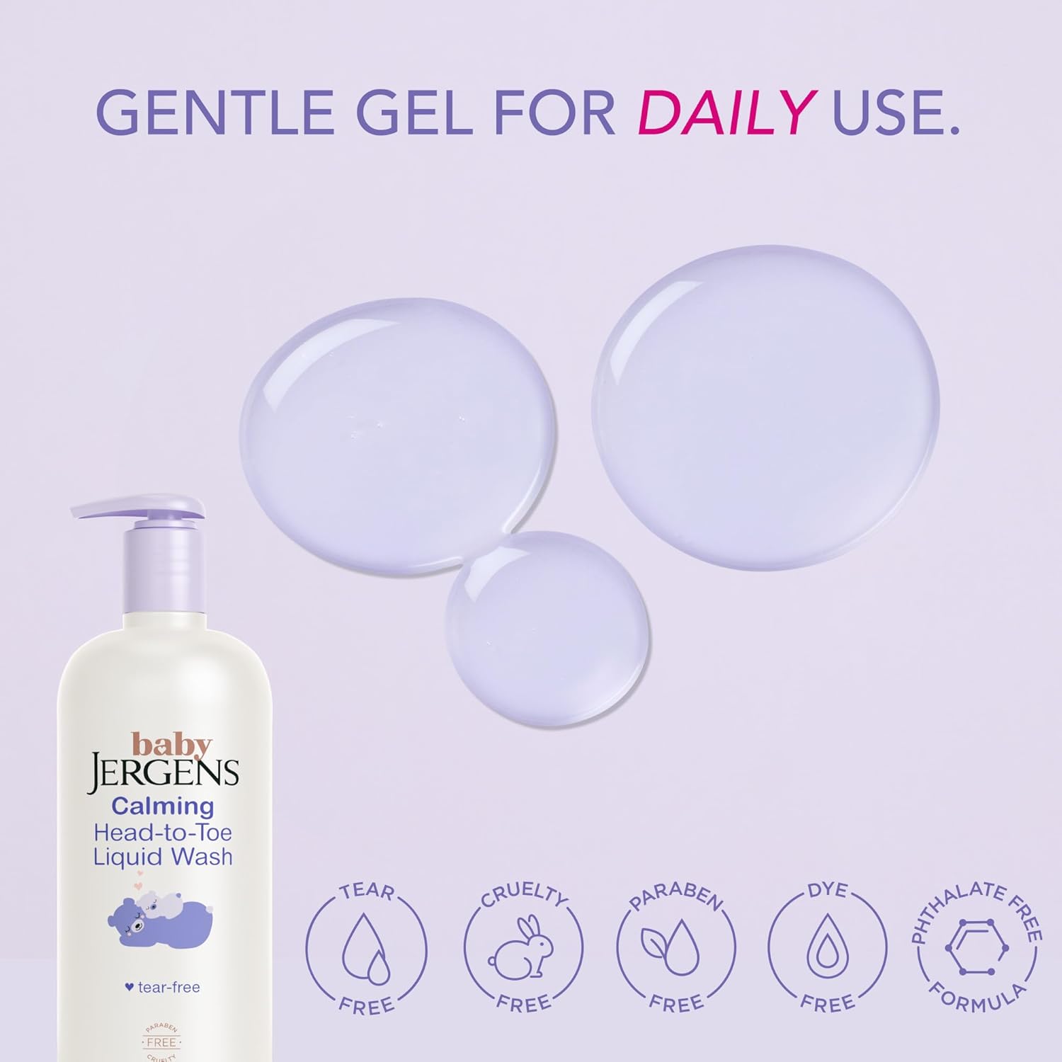 The new Baby Jergens collection is a familiar kind of feel good because it’s a brand that’s been trusted for generations. And if you’re new to the Baby Jergens collection, Baby Jergens Calming Head to Toe Liquid Baby Wash is a perfect product to try. It’s a tear free baby wash and shampoo that gently cleanses and moisturizes your baby’s skin and hair. But don’t worry– it doesn’t dry skin out! Pediatrician and dermatologist tested, this body wash is great for baby's delicate skin and hair. Feel good knowing that it’s also paraben free, phthalate free formula, artificial dye free and cruelty free too. This formula is manufactured using 100% certified renewable energy and this baby wash formula is safe for the environment by maximizing biodegradability and respecting aquatic life. Not only is it suitable for your baby, but this baby shampoo and body wash can be part of a night time routine to help calm your baby before bed. Infused with Shea and lavender oils, our baby wash creates a soothing atmosphere that’s comforting at night time when paired with Baby Jergens Calming Lotion. Use this calming routine daily for sweeter dreams: first, run a warm bath. Next, spread 1-2 pumps of the baby wash onto your baby’s skin and hair. Then rinse thoroughly, dry off, pair with the Baby Jergens Calming Lotion and snuggle up. Try our whole line of gentle, nurturing baby products from Jergens, a brand trusted for generations. Baby Jergens Calming Lotion softens, Baby Jergens Soothing Sensitive Skin Cream soothes dry skin and Baby Jergens All-Purpose Ointment helps lock in moisture. The whole collection gives you that feel-good feeling because Jergens has been around for over a hundred years, using trusted ingredients that you can feel good about using on even the tiniest loved ones in your family,GENTLY CLEANSES - This tear free baby shampoo and body wash gently cleanses and moisturizes your baby’s delicate skin and hair without drying out skin,CALMING BABY HEAD-TO-TOE WASH - Infused with shea and lavender oils, this wash when paired with Baby Jergens Calming Lotion, creates a calm, soothing atmosphere for your baby's nighttime routine,BATH-SIDE PUMP - Reach for this baby wash–it dispenses easily so you can lather it in your hands,INGREDIENTS YOU CAN TRUST - Pediatrician and dermatologist tested, this body wash is great for baby's delicate skin, paraben free, phthalate free formula, free of artificial dyes and cruelty free too,MORE THAN BABY WASH AND SHAMPOO - Try our whole line of gentle, nurturing baby products that soften, nourish, soothe and cleanse, from a brand trusted for generations