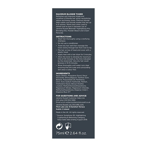 Product Information:PLATINUM BLONDE COLOUR TONER for use on pre-lightened and natuarally blonde hair. Non permanent. No ammonia or peroxide,Features:Platinum blonde adds subtle cool blonde shades that last up to 8 washes,Benefit:Refresh and improve the shade and condition of your blonde hair in one wash! Easy to use and ideal for refreshing your colour, as it neutralises yellow and brassy tones, restoring natural, subtle blonde tones,Warning or Restrictions:We advise, and it is stated on the product instructions, everyone should perform a strand test before dyeing their hair, even if they have used the product before, as that ensures they will achieve the right result,Product Specification:Aqua, Propylene Glycol, Decyl Glucoside, Ethoxydiglycol, Xanthan Gum, Betaine, Polysorbate-20, Panthenol, Citric Acid, Sodium Hydroxide, Parfum, Linalool, Triethylene Glycol, Benzyl Alcohol, Methylchloroisothiazolinone, Methylisothiazolinone, Magnesium Nitrate, Magnesium Chloride, Disperse Violet 1, Disperse Blue 377,Product Uses:Wash hair thoroughly using a clarifying shampoo. Do not use a conditioner. Massage toner through towel dried hair evenly from root to tip. Pile hair on top of head and cover with a plastic hood. Apply heat with a hair dryer for 5 minutes. Allow the toner to develop for maximum time of 30minutes or the time indicated on the strand test. Very dry hair could process in 10-15 minutes. Rinse thoroughly until water runs clear ensuring that the scalp and surrounding skin area is colour free,Recyclable:Carton & plastic bottle are recyclable,Tips and Advice:Always read the Application Guide included in the carton