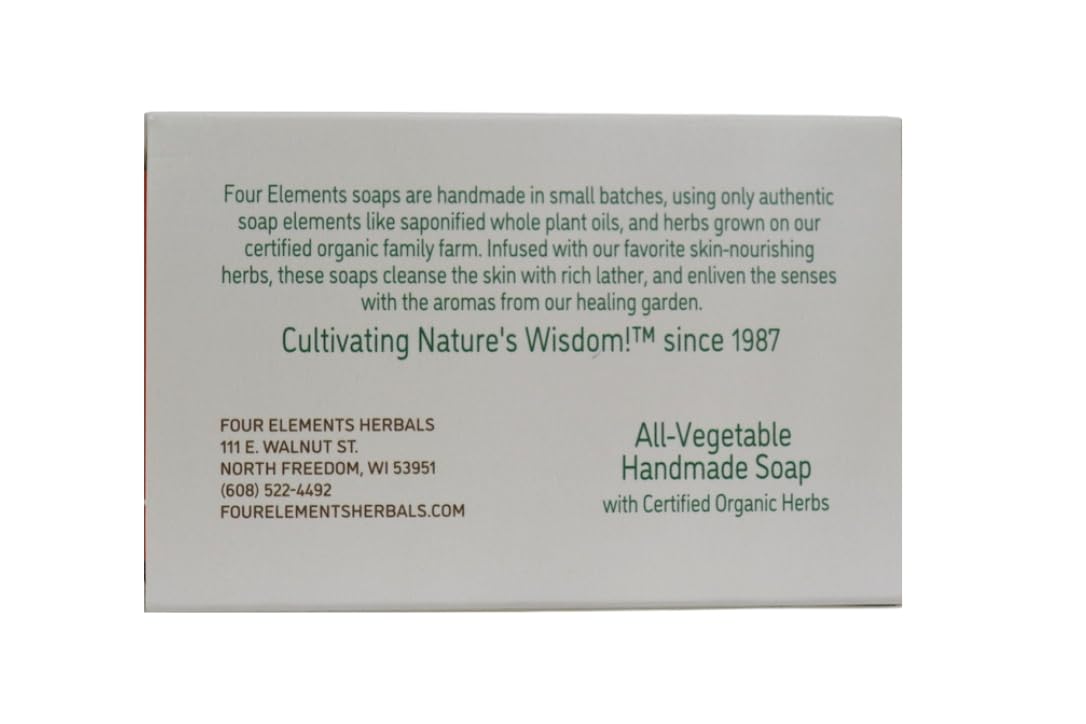 About this item Four Elements 4E handmade organic soap. Ideal for soothing skin after encounters with outdoor irritants. Perfect for landscapers, gardeners, campers, hunters, hikers, and outdoor adventurers alike! Gentle and natural ingredients make it suitable for all seasons and skin types, perfect for both adults and children. Elements: saponified coconut, olive and palm oils, infusion of jewelweed and chickweed. Four Elements Organic Herbals is an all-women owned and operated certified organic farm where all our herbs are meticulous hand-harvested and thoughtfully curated. Grown, crafted and packaged in Wisconsin, USA since 1987. Disclaimer: Four Elements 4E products do not intend to diagnose, treat, cure or prevent any disease. See more product details,Four Elements 4E handmade organic soap,Ideal for soothing skin after encounters with outdoor irritants. Perfect for landscapers, gardeners, campers, hunters, hikers, and outdoor adventurers alike!,Gentle and natural ingredients make it suitable for all seasons and skin types, perfect for both adults and children,Elements: saponified coconut, olive and palm oils, infusion of jewelweed and chickweed,Four Elements Organic Herbals is an all-women owned and operated certified organic farm where all our herbs are meticulous hand-harvested and thoughtfully curated. Grown, crafted and packaged in Wisconsin, USA since 1987,Disclaimer: Four Elements 4E products do not intend to diagnose, treat, cure or prevent any disease