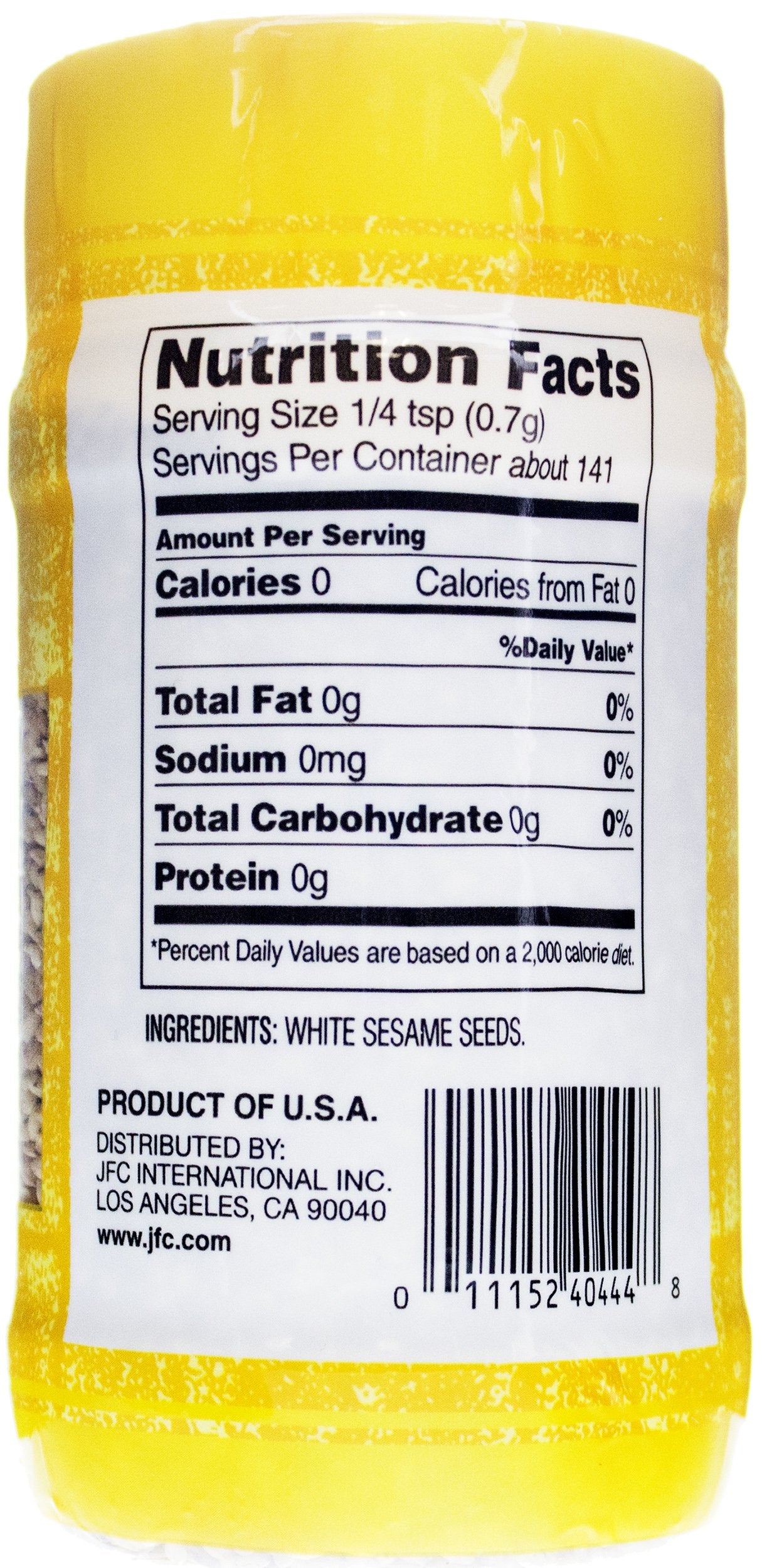 Sesame Seed, White, Roasted, Jar 3.5 OZ www.jfc.com. Product of USA. 3.5 oz (99 g) Los Angeles, CA 90040. Sesame Seed, White, Premium Roasted www.jfc.com. Product of USA