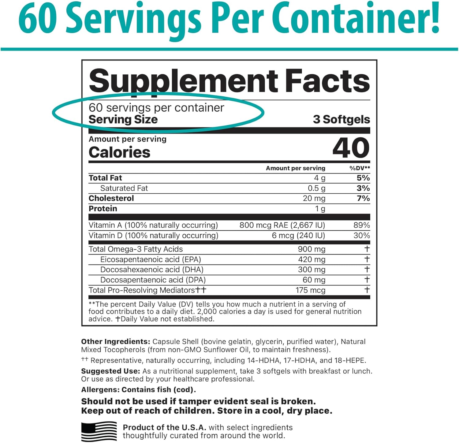 This comprehensive formula contains a full complement of Omega-3 Fatty Acids (Total of 900 mg) including EPA 420 mg, DHA 300 mg, and DPA 60 mg. Plus 175 mcg Pro-Resolving Mediators (PRMs). 60 day supply