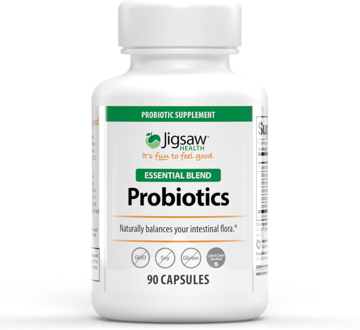 About this item Essential Blend Probiotics: Jigsaw Essential Blend Probiotics utilizes 5 billion of each of the 5 most clinically researched live probiotic strains available today to help you naturally balance your intestinal flora Protect Your Gut: Help your body balance essential friendly bacteria after antibiotic use, promote a healthy digestive system function and the synthesis of B-vitamins, and support its ability to absorb calcium, copper, iron, and magnesium Designed Release Capsule: Jigsaw's Probiotics use an innovative Designed Release Capsule that doesn’t start breaking down until 45 minutes after ingestion to give them time to get to the gut, where they will be needed most Quality Statement: We understand that your end goal is to feel better and our products have been designed and formulated to make a noticeable difference; We love our products and believe you will too It's Fun To Feel Good: Since 2005, Jigsaw Health has been developing and delivering the highest quality nutritional supplements; We are here to help people feel healthy and happy because it's fun to feel good See more product details,Essential Blend Probiotics: Jigsaw Essential Blend Probiotics utilizes 5 billion of each of the 5 most clinically researched live probiotic strains available today to help you naturally balance your intestinal flora,Protect Your Gut: Help your body balance essential friendly bacteria after antibiotic use, promote a healthy digestive system function and the synthesis of B-vitamins, and support its ability to absorb calcium, copper, iron, and magnesium,Designed Release Capsule: Jigsaw's Probiotics use an innovative Designed Release Capsule that doesn’t start breaking down until 45 minutes after ingestion to give them time to get to the gut, where they will be needed most,Quality Statement: We understand that your end goal is to feel better and our products have been designed and formulated to make a noticeable difference; We love our products and believe you will too,It's Fun To Feel Good: Since 2005, Jigsaw Health has been developing and delivering the highest quality nutritional supplements; We are here to help people feel healthy and happy because it's fun to feel good