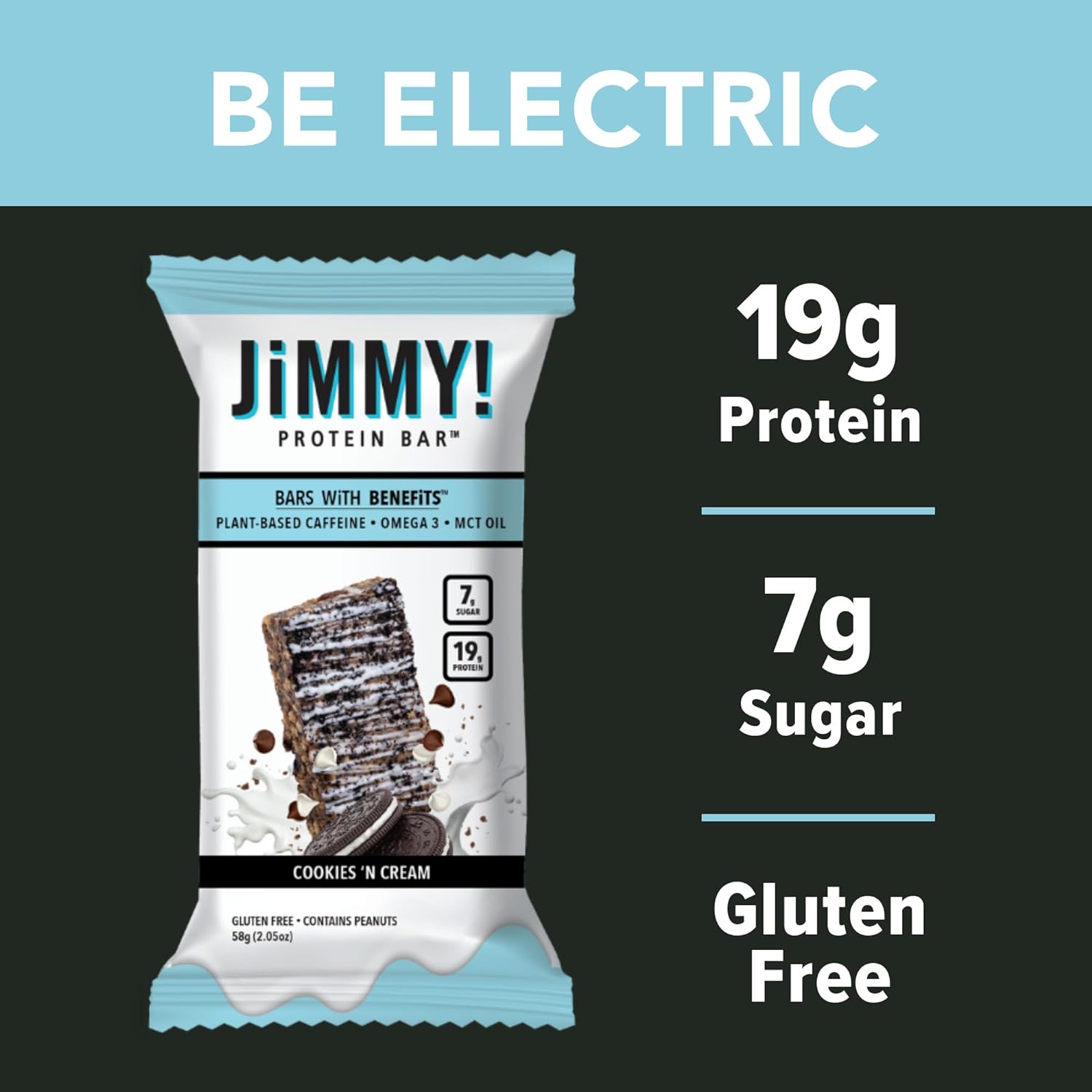 DESCRIPTION : JiMMY! Protein Bar, Cookies and Cream, Wake and Focus, 12 Count - Energy Bar with Caffeine, Omega 3 and MCT Oils, Low Sugar, High Protein