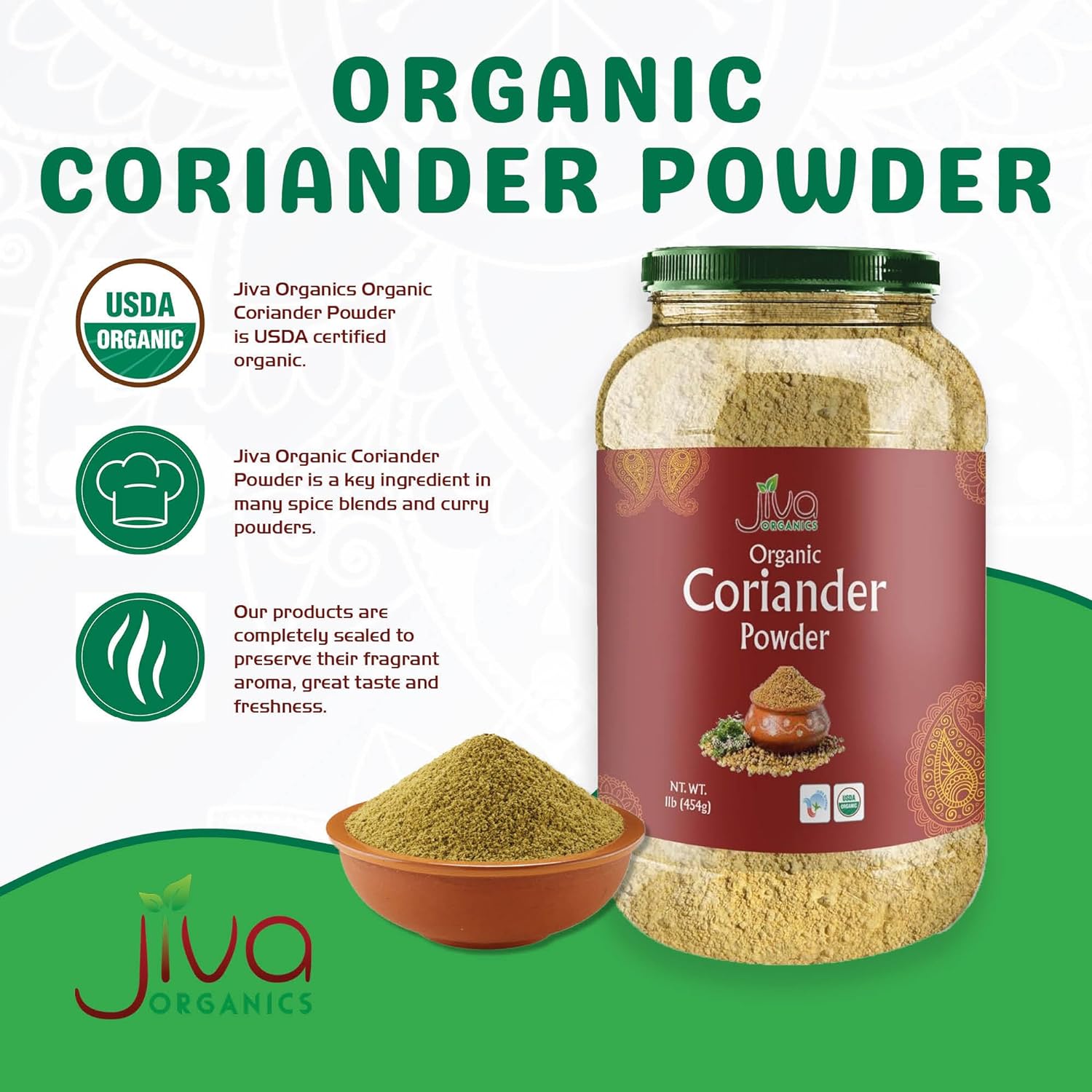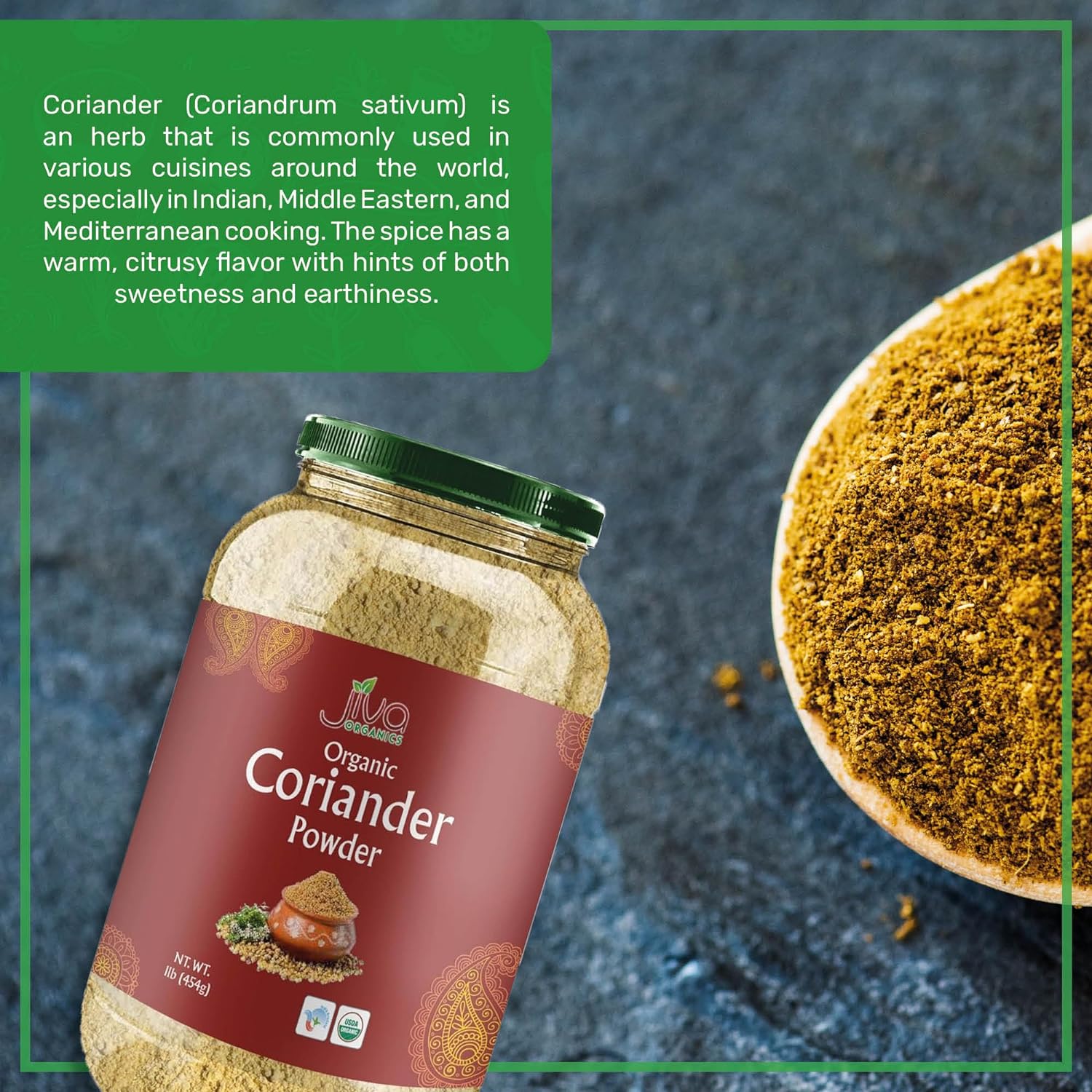 Jiva Organic Coriander Powder 1 Pound Large Jar (16Oz) - Pure, Non-Gmo, Lab Tested, 100% Raw Ground Coriander From India