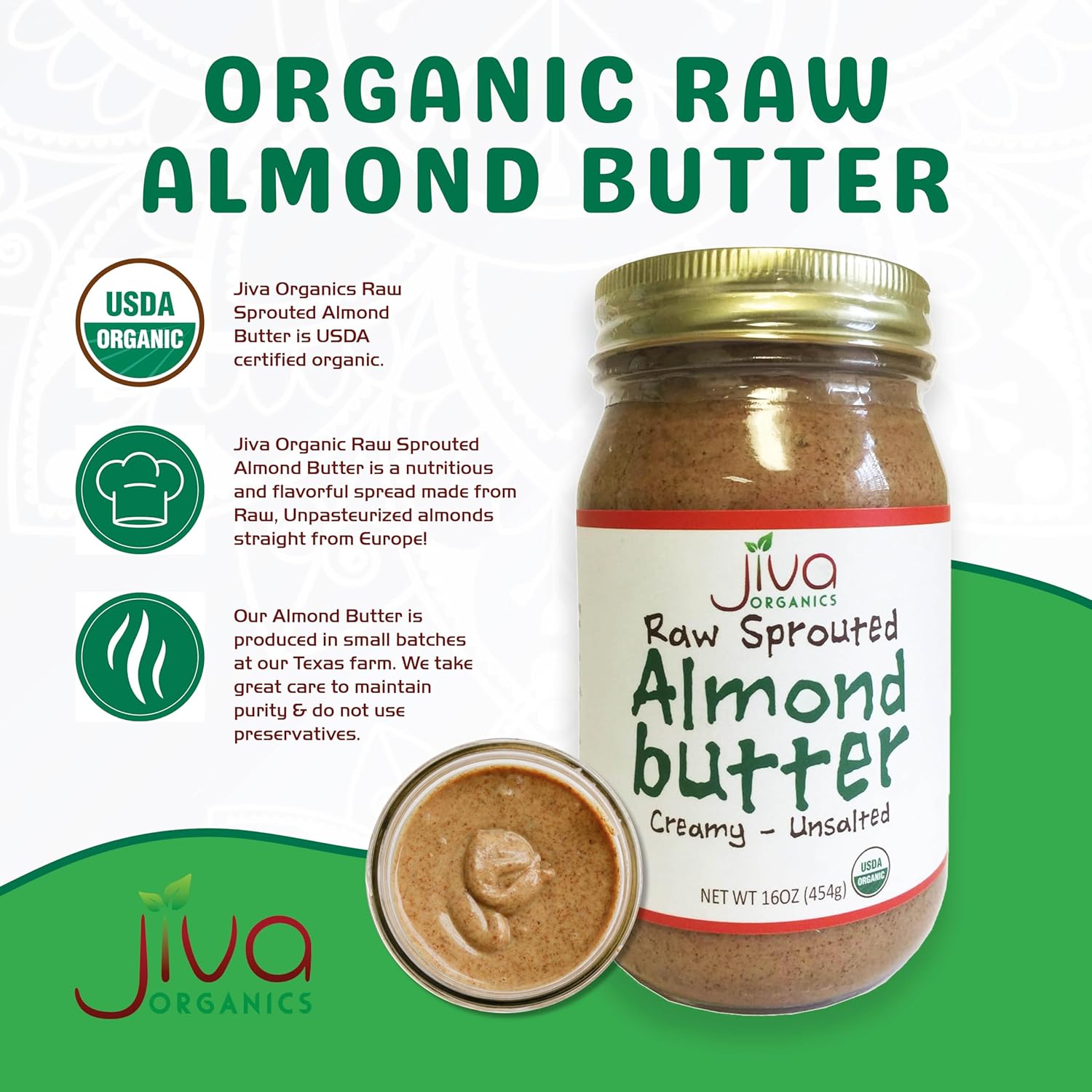 About this item LARGE VALUE 1 POUND SIZE! Only one ingredient - 100% USDA Organic Raw Sprouted Almonds. We soak our almonds for 24 hours! Our almonds have NEVER been pasteurized unlike other almonds Add to fruit, shakes, cereal, sandwiches, confections or eat right out of the jar Made with love and devotion the old fashioned way on a small farm in rural Texas Creamy & Unsalted Almond Butter - Seriously the best we've ever tasted! See more product details,LARGE VALUE 1 POUND SIZE! Only one ingredient - 100% USDA Organic Raw Sprouted Almonds. We soak our almonds for 24 hours!,Our almonds have NEVER been pasteurized unlike other almonds,Add to fruit, shakes, cereal, sandwiches, confections or eat right out of the jar,Made with love and devotion the old fashioned way on a small farm in rural Texas,Creamy & Unsalted Almond Butter - Seriously the best we've ever tasted!