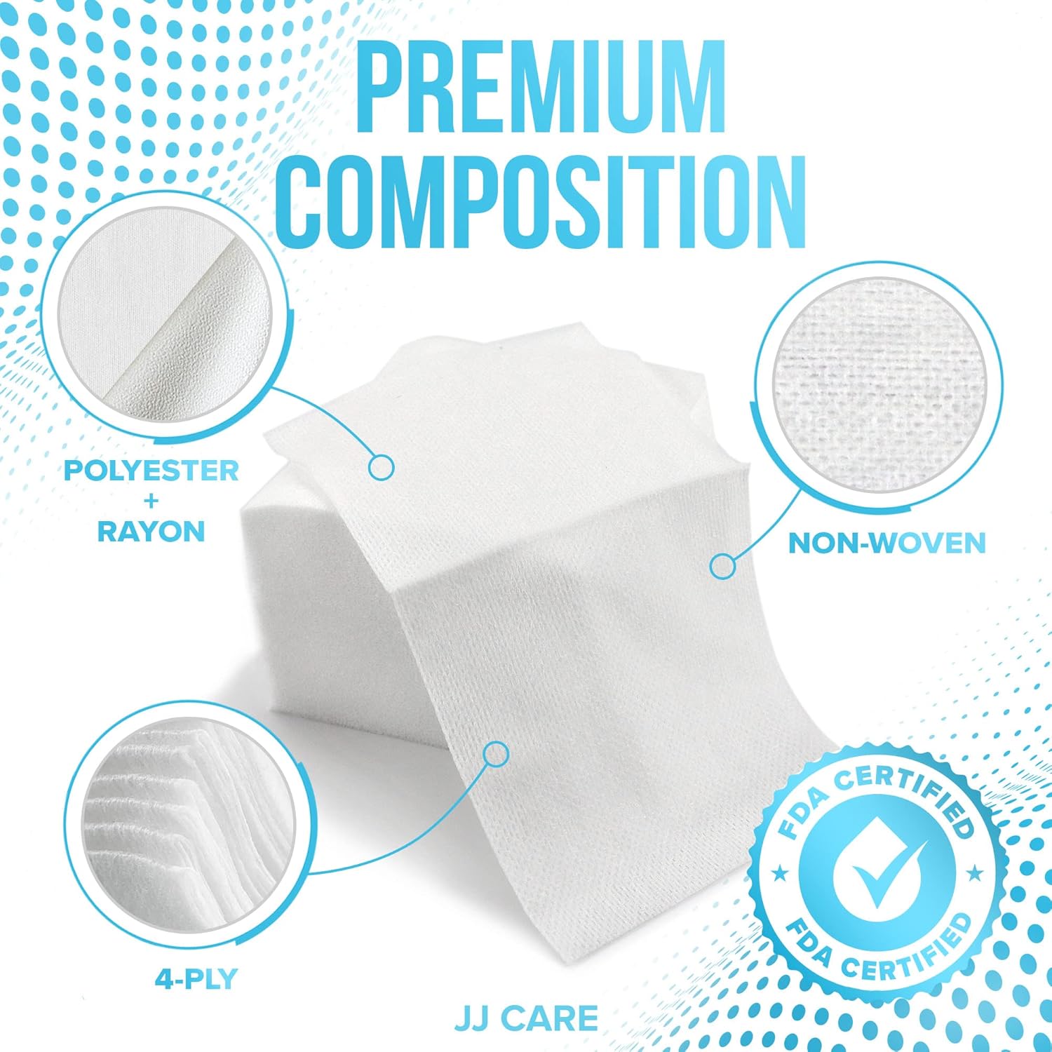 IDEAL FOR FACIAL, MEDICAL & DENTAL USE. Compared to traditional cotton gauze, JJ CARE Non-woven Gauze Sponges are thicker and more absorbent and can be used for several different applications. They’re ideal for facial use, disinfecting and cleaning wounds, applying ointments and other general cleaning, even wiping off your equipment for sanitary purposes