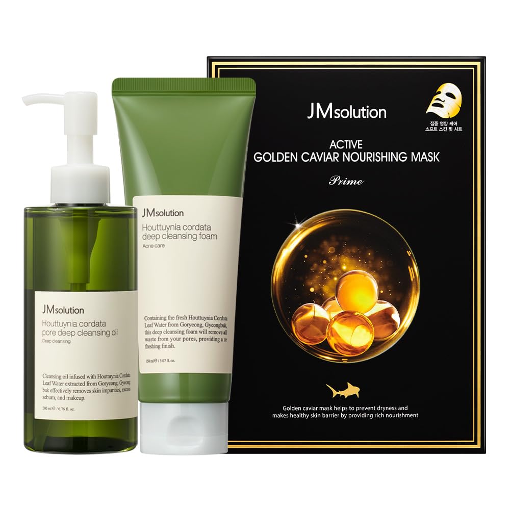 Jmsolution Skin Care Bundle- Heart Leaf Micro Cleansing Oil, Foam And Active Golden Cavior Mask