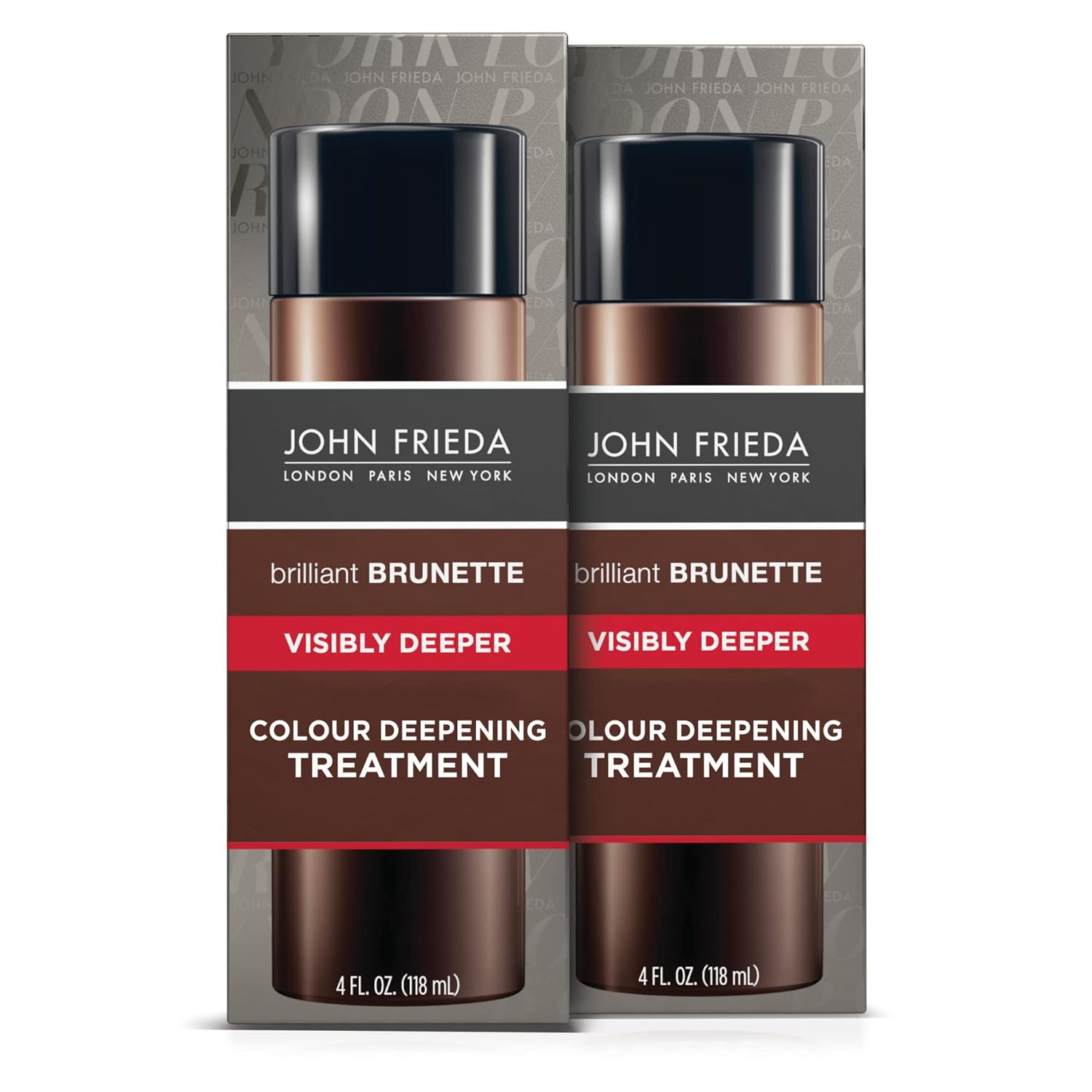 Nourish dry hair and deliver brilliant shine while enhancing the richness of your brunette hair. Intensify your natural or colour-treated brunette hair up to one shade darker in just five minutes. This color safe, in-shower weekly treatment works in place of your conditioner to hydrate and boost shine while enhancing all shades of brunette hair with rich, chocolate tones. Use once a week with John Frieda Brilliant Brunette Visibly Deeper Colour Deepening Shampoo for best results. Satisfaction Guaranteed. Limitations may applyDEEPENS COLOR AFTER ONE USE - Intensify your color in just 5 minutes with our color deepening treatment designed for all shades of brunette hairRICH & NOURISHING FORMULA FOR BRUNETTE HAIR - This blend of ingredients was specifically designed to elevate your brunette color and give you indulgent shades of brunette hairCOLOR DEEPENING TREATMENT - Boost your color with this penetrating brunette color treatment for natural or color treated hairA SURGE OF DEEPER, DARKER COLOR AFTER 1 USE - Dare to go darker with John Frieda. Test our product and see results after just one use