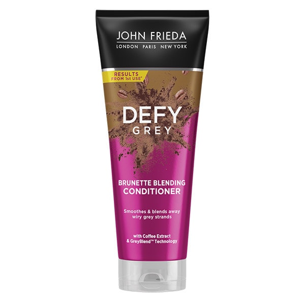John Frieda Defy Grey Brunette Blending Conditioner 250ml smooths & blends away wiry grey strands. Key Features: Smooths & blends away wiry grey strands With Coffee Extract & GreyBlend™ Technology Tame and blend away greys with smoothing moisture & rich brunette tones. Formulated with coffee extract and GreyBlend™ Technology, Defy Grey Conditioner helps soften & blend away wiry grey strands