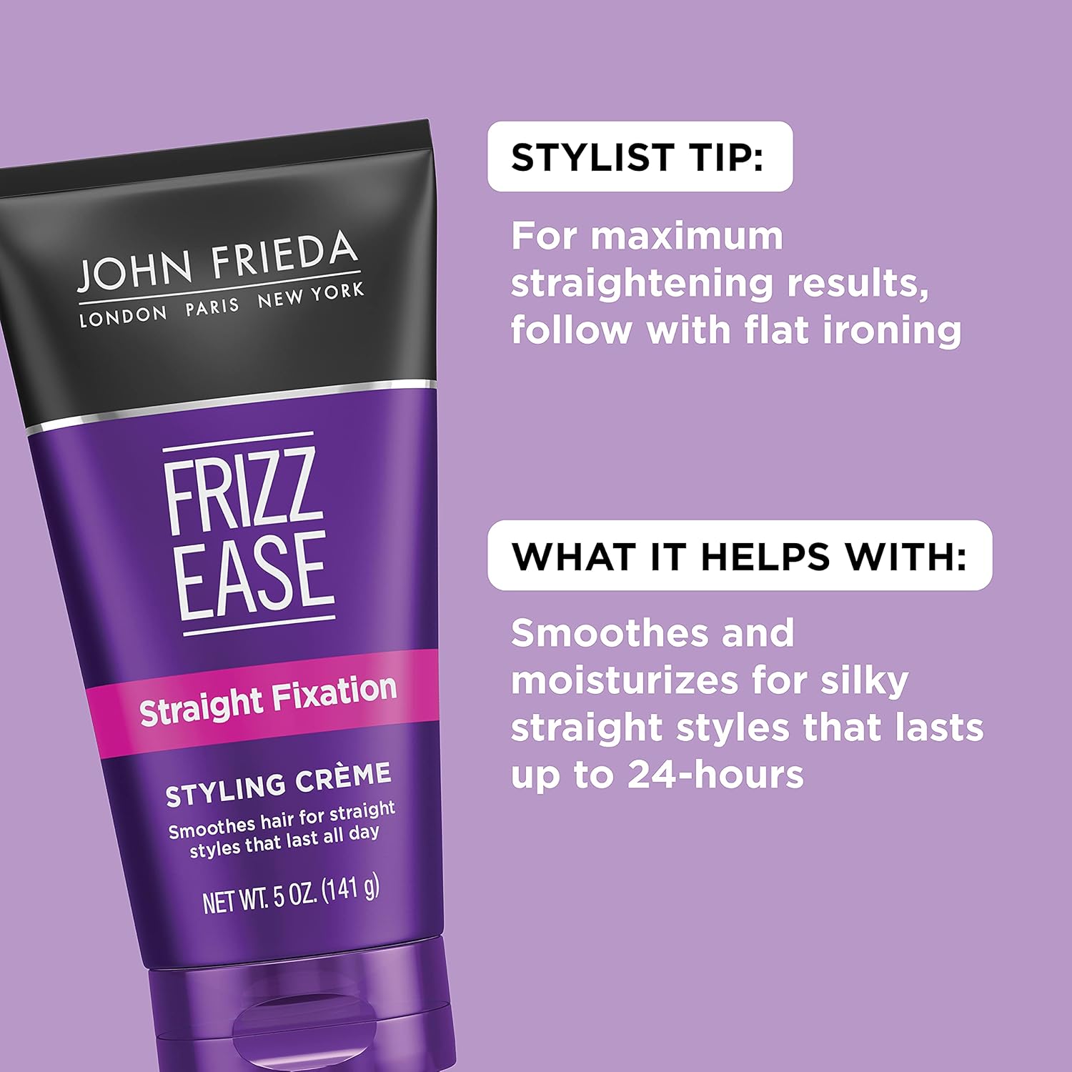 Block Out Frizz And Keep Hair Sleek And Straight For Up To 24 Hours With John Frieda Frizz Ease Straight Fixation Styling Creme. This Hair-Straightening Cream With ThermaguardĀ® Complex Protects Against Heat Damage While Helping You Achieve Perfectly Styled, Sleek Straight Hair. A Straightening, Smoothing Styling Cream That Moisturizes And Smooths Frizzy Hair For Silky-Straight Style. This Product Can Be Used Daily To Keep Your Hair Glossy, In Place, And Fights Frizz For Up To 24 Hours! Infused With Milk Protein And Sweet Almond Oil, It Conditions Hair, Perfect For Sleek, Shiny, Hair Frizz-Free Hair