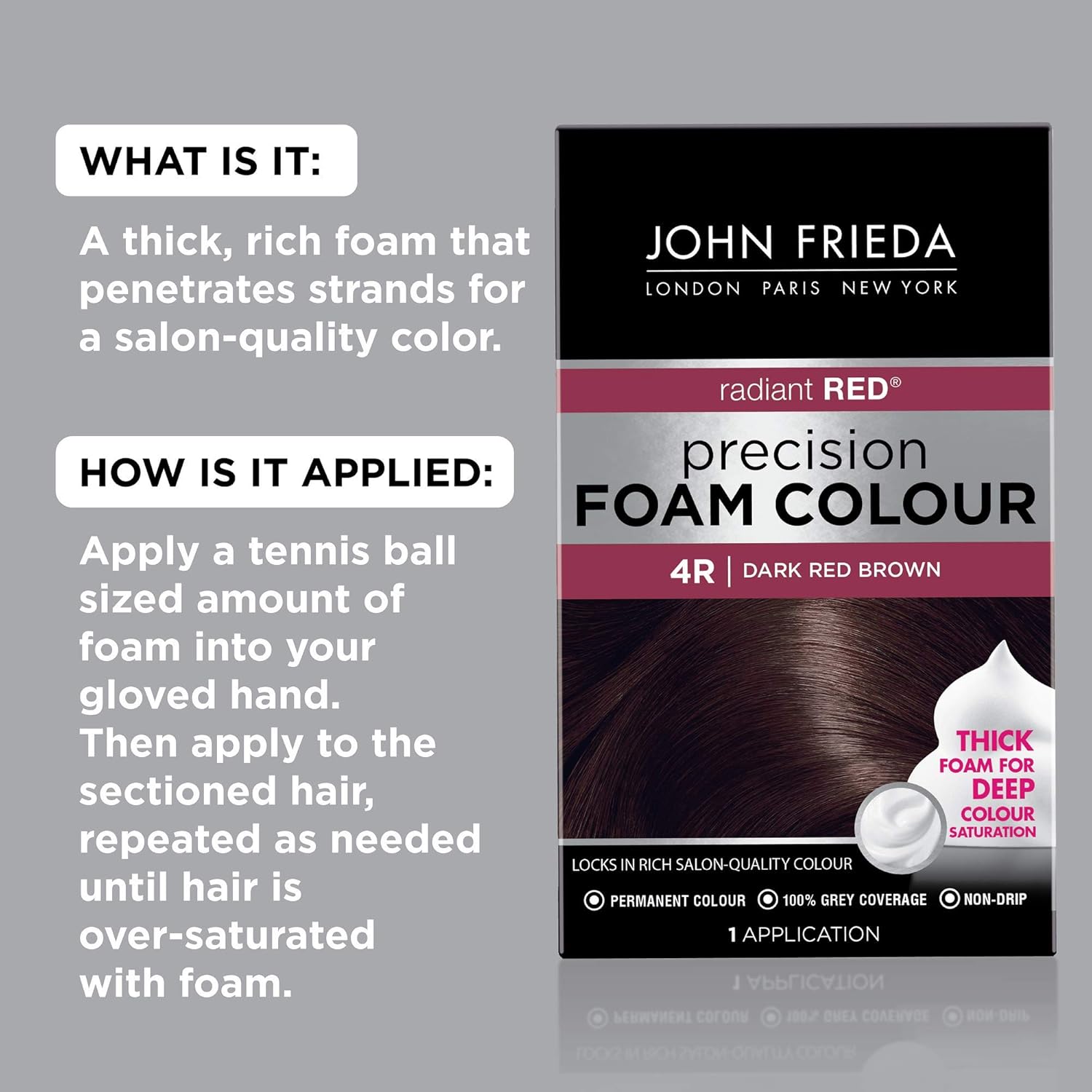 Our Thick, Saturating Foam Helps Lock In Rich, Salon-Quality Color. John Frieda Precision Foam Color, Dark Red Brown 4R, Color-Nourishing Permanent Hair Color Kit'S Non-Drip Foam Formula Penetrates Strands For Deep Color Saturation And Spreads Easily Into Roots And Hard-To-Reach Areas, For Complete Coverage Without Patchiness. 100% Grey Coverage. Anti-Fade Dark Red Brown Color. Nourishing After-Color Conditioner Seals In Color For Long-Lasting, Tonal Richness With Minimal Post-Coloring Mess. This Product Will Give You The Intense Dark Red Brown Color You Always Wanted While Nourishing And Moisturizing Your Hair. Satisfaction Guaranteed. Limitations May Apply