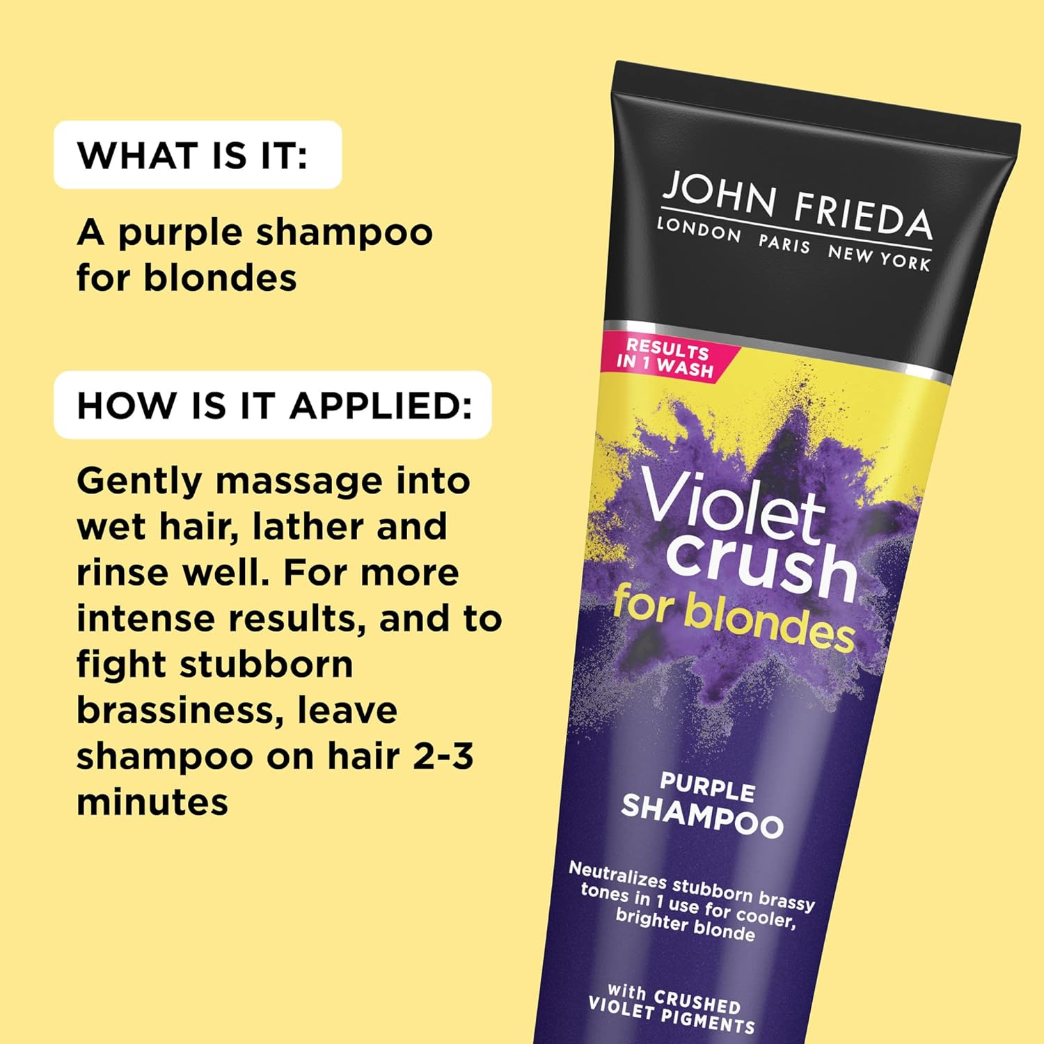 John Frieda Violet Crush Purple Shampoo kisses brassiness goodbye in as little as one wash. This intense formula by Kao USA cleanses while instantly neutralizes brassy tones for fresh and brighter hair. Deposits crushed violet pigments into blonde hair to counter-act yellow tones to make color-treated or highlighted blonde hair appear cooler and brighter in as little as one use. Satisfaction Guaranteed. Limitations may applyKNOCKS OUT BRASSY TONES - Rid your hair of brassy tones and revive your hair with Violet Crush ShampooSALON-FRESH BLONDE - Enhance your color and discover your best blondeCRUSHED VIOLET PIGMENTS - Deposits crushed violet pigments into blonde hair to counter-act yellow tones to make color-treated or highlighted blonde hair appear cooler and brighter in as little as one useBEST USED WITH VIOLET CRUSH PURPLE CONDITIONER - Use with John Frieda Violet Crush Purple Conditioner to achieve optimal results