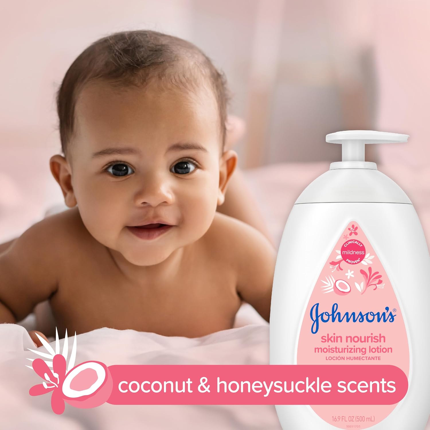 About this item 16.9-fluid ounces of Johnson's Skin Nourish Moisturizing Baby Body Lotion has a soothing coconut and honeysuckle scent and provides 24 hour lightweight moisture that is suitable for the whole family This body lotion is designed to help soothe and relieve dry skin for all day, 24 hour moisture that is suitable for babies, kids and adults. In fact, 96% agree this daily body lotion leaves skin feeling soft and smooth The moisturizing lotion with a lightweight texture has a non-greasy feel and is clinically proven to be mild. The lotion is enriched with moisturizers and gentle coconut and honeysuckle scents to nourish baby's skin This hypoallergenic baby body lotion has been tested with pediatricians and dermatologists and is clinically proven to be mild. Formulated free of parabens, phthalates and dyes, making it suitable for the whole family Baby lotion for dry skin is a great addition to a regular skincare routine. After a warm bath or shower with Johnson's Skin Nourish Wash, gently massage lotion over entire body to leave skin feeling soft and smooth See more product details,16.9-fluid ounces of Johnson's Skin Nourish Moisturizing Baby Body Lotion has a soothing coconut and honeysuckle scent and provides 24 hour lightweight moisture that is suitable for the whole family,This body lotion is designed to help soothe and relieve dry skin for all day, 24 hour moisture that is suitable for babies, kids and adults. In fact, 96% agree this daily body lotion leaves skin feeling soft and smooth,The moisturizing lotion with a lightweight texture has a non-greasy feel and is clinically proven to be mild. The lotion is enriched with moisturizers and gentle coconut and honeysuckle scents to nourish baby's skin,This hypoallergenic baby body lotion has been tested with pediatricians and dermatologists and is clinically proven to be mild. Formulated free of parabens, phthalates and dyes, making it suitable for the whole family,Baby lotion for dry skin is a great addition to a regular skincare routine. After a warm bath or shower with Johnson's Skin Nourish Wash, gently massage lotion over entire body to leave skin feeling soft and smooth