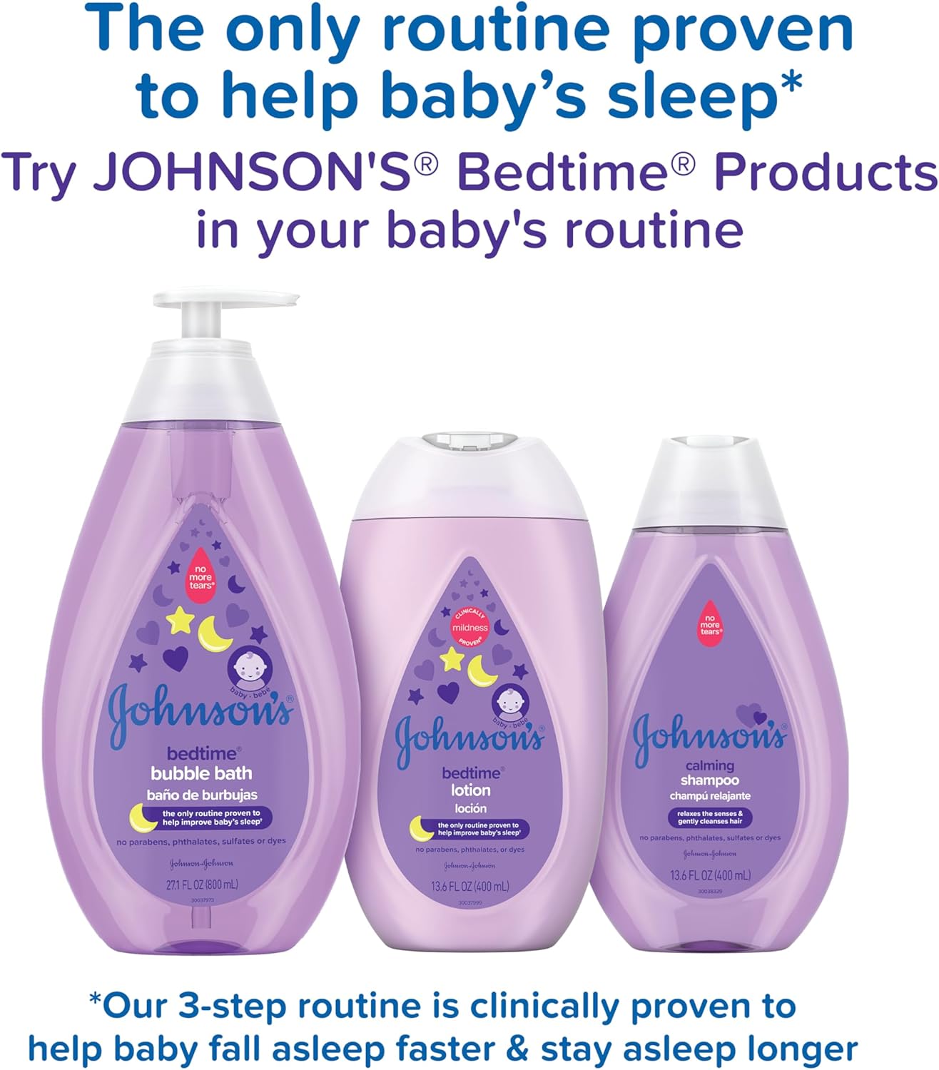 About this item 27.1-fluid ounces of Johnson's Bedtime Baby Bubble Bath gently cleanses and calms your baby with fun bubbles while featuring a special aromatic blend that helps to soothe and relax your little one before bed This soothing baby bath is made with relaxing NaturalCalm essences, a unique blend of gentle and calming aromas, and is hypoallergenic with no parabens, phthalates, sulfates or dyes Made with No More Tears formula, this tear-free baby bath is gentle on eyes and features calming, soothing aromas that help baby relax before bed Pediatrician- and dermatologist-tested, this nighttime bubble bath gently cleanses baby's delicate skin and is good for babies, toddlers and kids of all ages This calming baby bath creates fun bubbles making bath time more enjoyable and can be used in the evening as part of Johnson's clinically proven routine of warm bath, gentle massage and quiet time to help your child get a peaceful night's sleep See more product details,27.1-fluid ounces of Johnson's Bedtime Baby Bubble Bath gently cleanses and calms your baby with fun bubbles while featuring a special aromatic blend that helps to soothe and relax your little one before bed,This soothing baby bath is made with relaxing NaturalCalm essences, a unique blend of gentle and calming aromas, and is hypoallergenic with no parabens, phthalates, sulfates or dyes,Made with No More Tears formula, this tear-free baby bath is gentle on eyes and features calming, soothing aromas that help baby relax before bed,Pediatrician- and dermatologist-tested, this nighttime bubble bath gently cleanses baby's delicate skin and is good for babies, toddlers and kids of all ages,This calming baby bath creates fun bubbles making bath time more enjoyable and can be used in the evening as part of Johnson's clinically proven routine of warm bath, gentle massage and quiet time to help your child get a peaceful night's sleep