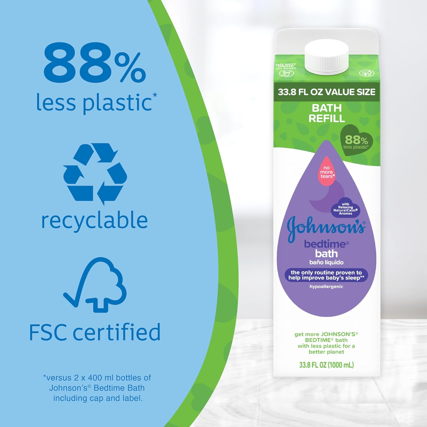 About this item Value size 33.8-fluid ounce refill pack of Johnson's Bedtime Bath gently cleanses & calms your baby with a special aromatic blend that helps to soothe & relax your little one before bed. Use this carton to refill your Johnson's Bedtime Bath bottles Tested by pediatricians, dermatologists & ophthalmologists, the tearless baby bath is designed for baby's delicate skin & features relaxing NaturalCalm aromas, a blend of floral aromas designed to help soothe baby in preparation for sleep The tear-free, hypoallergenic liquid baby bath is formulated free of parabens, phthalates & dyes so it is gentle enough for baby's skin. Use as a part of a 3-step bedtime routine: warm bath, a gentle massage & quiet time to improve baby's sleep To refill your Johnson's Bedtime Bath bottles, squeeze the sides of the cap or pump, twist & pull up to remove. Pour the bath solution into the empty bottle & click cap or pump back on & close the refill. Recycle the refill carton when empty New paper-based carton uses plastic for the cap & thin layers inside to protect the integrity of this nighttime baby bath formula. Packaging is recyclable & has 88% less plastic* *vs 2x400 mL bottles of Johnson's Bedtime Bath including cap & label See more product details,Value size 33.8-fluid ounce refill pack of Johnson's Bedtime Bath gently cleanses & calms your baby with a special aromatic blend that helps to soothe & relax your little one before bed. Use this carton to refill your Johnson's Bedtime Bath bottles,Tested by pediatricians, dermatologists & ophthalmologists, the tearless baby bath is designed for baby's delicate skin & features relaxing NaturalCalm aromas, a blend of floral aromas designed to help soothe baby in preparation for sleep,The tear-free, hypoallergenic liquid baby bath is formulated free of parabens, phthalates & dyes so it is gentle enough for baby's skin. Use as a part of a 3-step bedtime routine: warm bath, a gentle massage & quiet time to improve baby's sleep,To refill your Johnson's Bedtime Bath bottles, squeeze the sides of the cap or pump, twist & pull up to remove. Pour the bath solution into the empty bottle & click cap or pump back on & close the refill. Recycle the refill carton when empty,New paper-based carton uses plastic for the cap & thin layers inside to protect the integrity of this nighttime baby bath formula. Packaging is recyclable & has 88% less plastic* *vs 2x400 mL bottles of Johnson's Bedtime Bath including cap & label