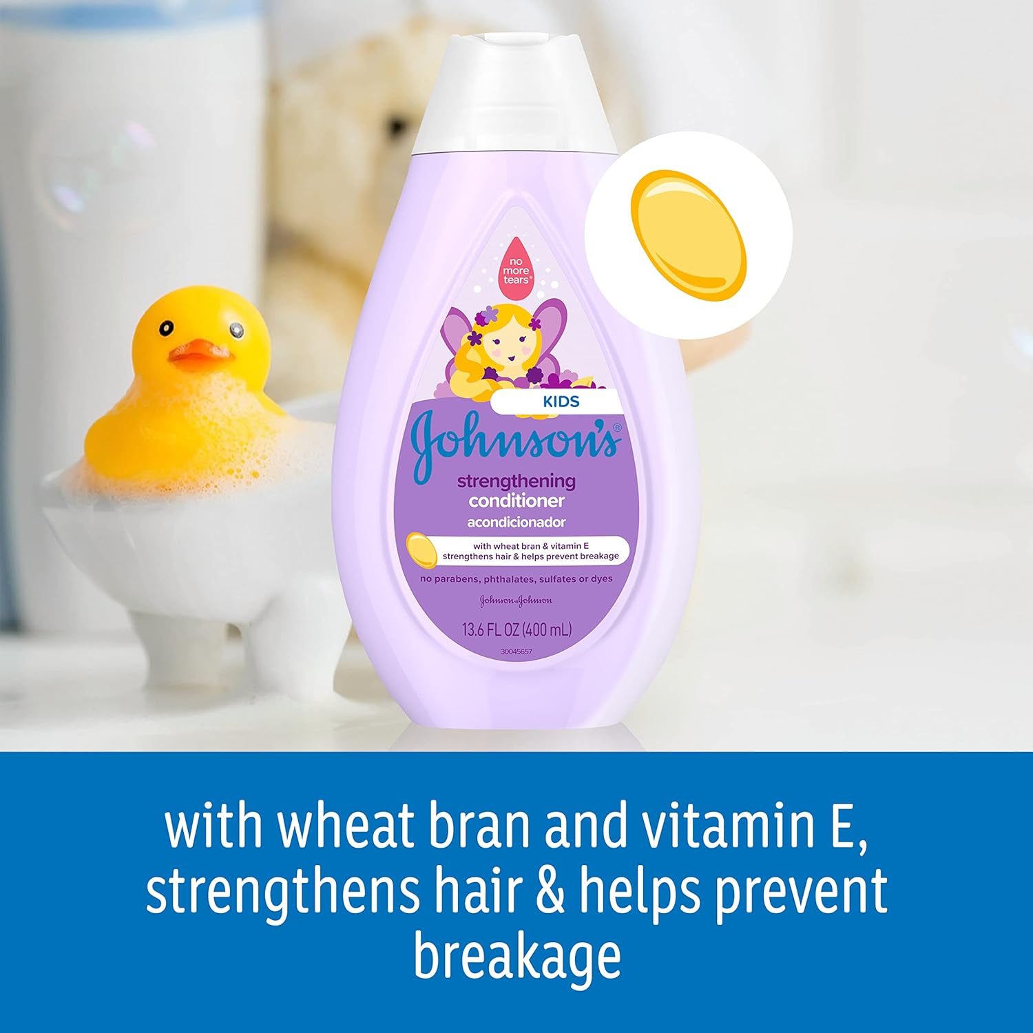 ABOUT THE PRODUCT: 1 > 13.6-fluid ounces bottle of Johnson's Strengthening Kid's Conditioner to nourish and leave hair strong and healthy-looking 2 > Formulated with vitamin E and wheat bran, this strengthening conditioner is suitable for use on children and toddlers and is designed to gently moisturize, strengthen and help prevent breakage to hair 3 > Specially designed to be milder than adult products, this hypoallergenic conditioner is paraben-, phthalate-, sulfate-, and dye-free, making it gentle enough for use on kids' and toddlers' developing hairClean and protect your child's hair with Johnson's Strengthening Tear-Free Kids' Conditioner. Specially designed to be milder than adult products so it's ideal for use on kids' and toddlers' developing hair, this nourishing conditioner gently moisturizes, strengthens, and helps prevent breakage. Like every Johnson's product, this children's anti-breakage conditioner is designed to meet or exceed the top internationally recognized regulatory standards. Formulated with vitamin E and wheat bran, the anti-breakage toddler conditioner is pediatrician and ophthalmologist tested and has a No More Tears tear-free formula that is as gentle to eyes as pure water. The hypoallergenic kids conditioner is paraben-, phthalate-, sulfate-, and dye-free, making it gentle enough for daily use on kids' and toddlers' developing hair. After using Johnson's Strengthening Kids Shampoo, dispense a small amount of the children's conditioner into your palm, gently work downward throughout hair, then rinse