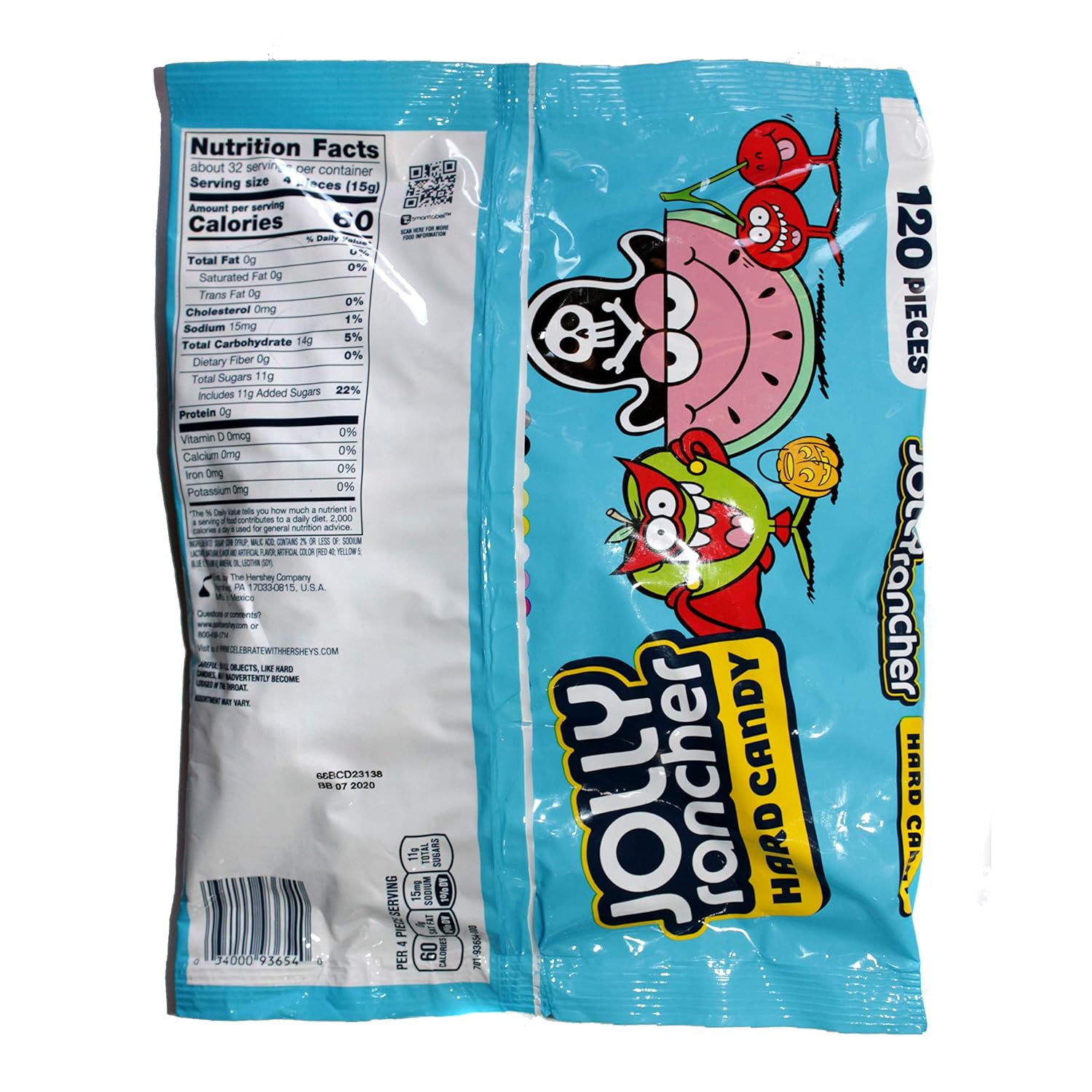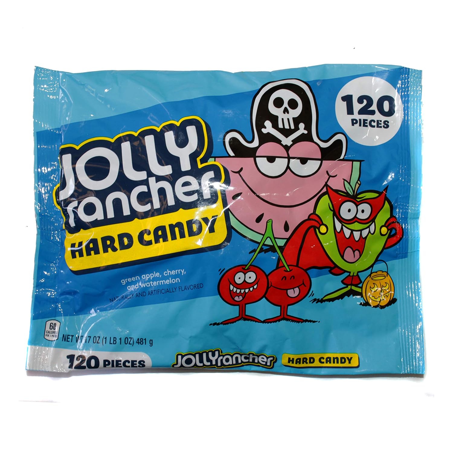 (1) Bag Jolly Rancher Hard Candy. 120 Individually Wrapped Pieces Per Bag. Assorted Flavors. Flavors: Green Apple, Cherry, Watermelon. Net Wt. 17 Oz / 1 Lb 1 Oz / 481 G