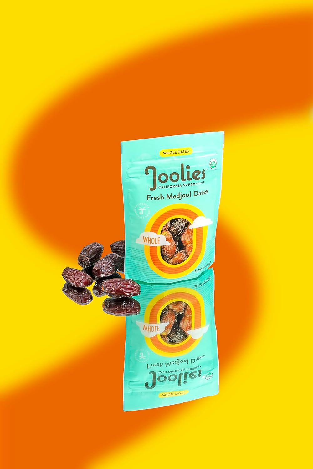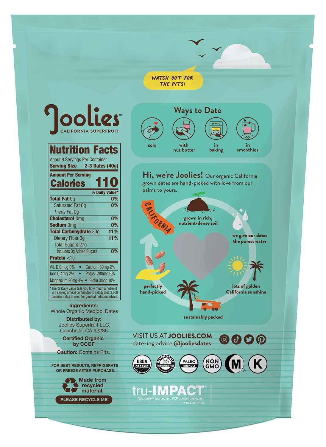 About this item LET'S DATE! – Stock up with a high-quality, nutrient-dense pouch of our organic medjool dates; These delicious superfruits are rich in essential vitamins, minerals and antioxidants, making them a healthy alternative to sugary snacks WHY ARE JOOLIES DATES SO GOOD AND GOOD FOR YOU – Our premium-quality, organic dates are soft, chewy and taste like sweet caramels; These fresh fruits are meaty, high in fiber, packed full of potassium and are a great source to boost natural energy GROWN IN CALIFORNIA AND CERTIFIED HEALTHY – Our gluten-free, non-GMO vegan fruits are naturally grown and handpicked in the Coachella Valley of southern CA; They’re paleo-friendly and have the following certifications – USDA organic, Kosher, Halal, glyphosate residue free JOOLIES SNACK HACKS – Sick of craving high-sugar snacks Do you want a fresh fruit alternative that’s tasty and healthy Try pairing our dates with nut butter as a delicious snack, or add it to your salad, ice cream, cookies, salted nut mixes, oatmeal, fruit platters, smoothies and more SUSTAINABLE BUSINESS PRACTICES TO SUPPORT A HEALTHY PLANET – Our products are packaged in hermetically-sealed pouches; In accordance of the Climate Collaborative, we use less plastic too; Our carbon footprint is small because we do all of our growing and business out of one location; Purchase these dates today to support your health system with a healthy treat See more product details,LET'S DATE! – Stock up with a high-quality, nutrient-dense pouch of our organic medjool dates; These delicious superfruits are rich in essential vitamins, minerals and antioxidants, making them a healthy alternative to sugary snacks,WHY ARE JOOLIES DATES SO GOOD AND GOOD FOR YOU – Our premium-quality, organic dates are soft, chewy and taste like sweet caramels; These fresh fruits are meaty, high in fiber, packed full of potassium and are a great source to boost natural energy,GROWN IN CALIFORNIA AND CERTIFIED HEALTHY – Our gluten-free, non-GMO vegan fruits are naturally grown and handpicked in the Coachella Valley of southern CA; They’re paleo-friendly and have the following certifications – USDA organic, Kosher, Halal, glyphosate residue free,JOOLIES SNACK HACKS – Sick of craving high-sugar snacks Do you want a fresh fruit alternative that’s tasty and healthy Try pairing our dates with nut butter as a delicious snack, or add it to your salad, ice cream, cookies, salted nut mixes, oatmeal, fruit platters, smoothies and more,SUSTAINABLE BUSINESS PRACTICES TO SUPPORT A HEALTHY PLANET – Our products are packaged in hermetically-sealed pouches; In accordance of the Climate Collaborative, we use less plastic too; Our carbon footprint is small because we do all of our growing and business out of one location; Purchase these dates today to support your health system with a healthy treat