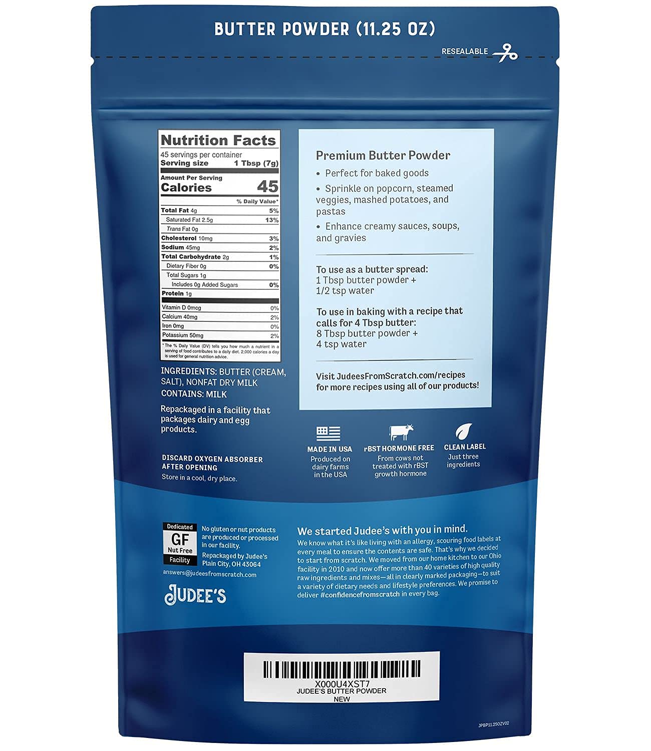 Judee’S Butter Powder 11.25 Oz - 100% Non-Gmo And Keto-Friendly - Rbst Hormone-Free - Gluten-Free And Nut-Free - Made From 100% Real Butter - Baking Ready Ingredient - Made In Usa