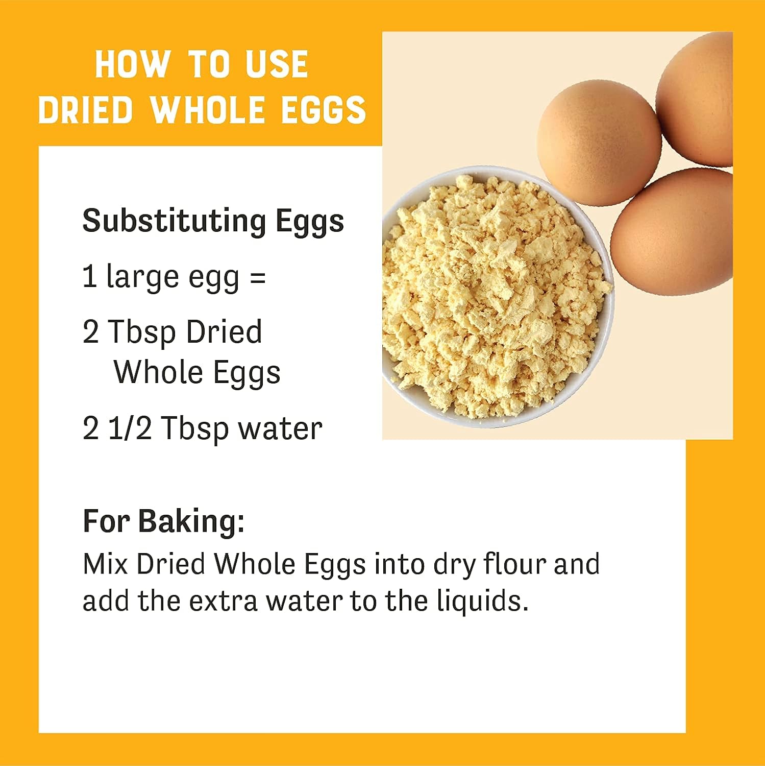 Enjoy the delicious flavor of fresh eggs any time you want! Our dehydrated Whole Eggs are made from dehydrated spray dried whole eggs and include both egg whites and yolks. With a number of culinary uses, this dried whole egg product can be used any place eggs are- simply add water to re-hydrate. Our 11 oz standup bag contains 24 servings. These dried powdered egg whites don't need to be refrigerated, so you save some time, money and shelf space. If you are searching for ways to reduce fat and cholesterol in your whole egg recipes, dehydrated egg whites make a healthy substitute. They are full of protein and iron, as well as being very low in fat, cholesterol and carbs. Whether you are baking, cooking or building up your food storage, keep a package of these egg whites handy and create some healthy options for your meals. Make a delicious brunch for a crowd. Our Scrambled Egg Mix can be used to make egg wraps, omelets, frittatas. Can also be used to bake quiche, batter french toast, or as an egg wash in baking or frying