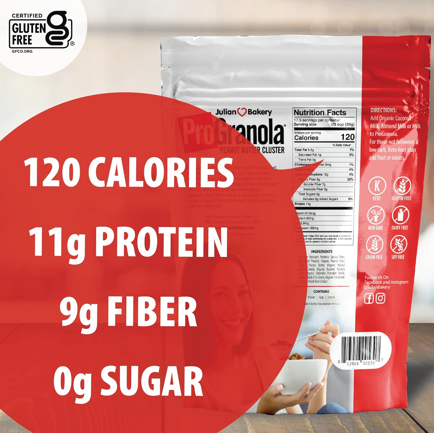 About this item Julian Bakery ProGranola Cereal | Peanut Butter Cluster | 12g Protein | 2 Net Carbs | Gluten-Free | Grain-Free | 14 Servings See more product details,Julian Bakery ProGranola Cereal | Peanut Butter Cluster | 12g Protein | 2 Net Carbs | Gluten-Free | Grain-Free | 14 Servings