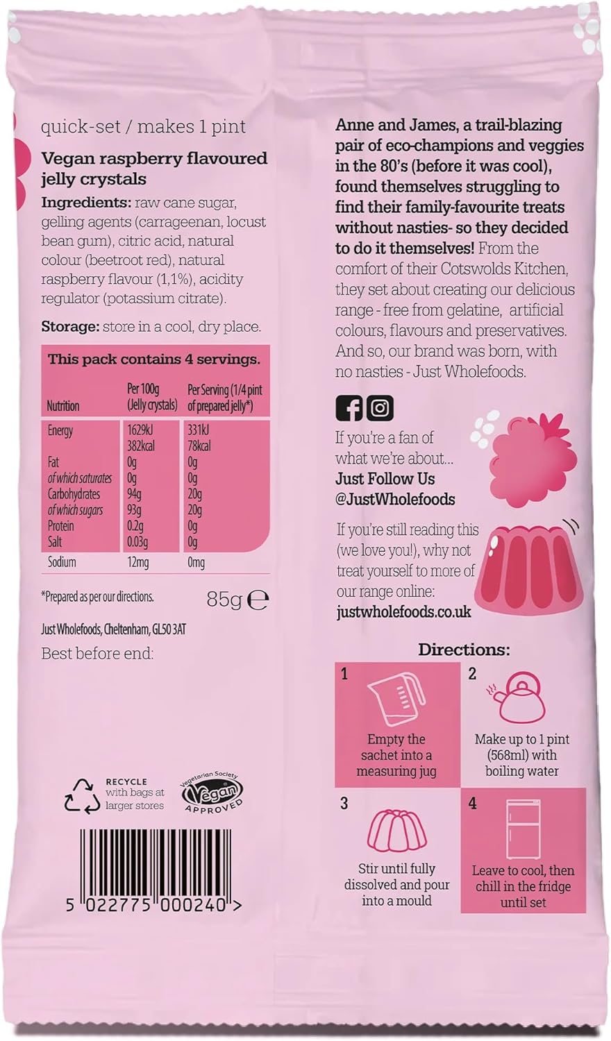 Just Wholefoods Vegan Jelly 12 X 85G | Gluten Free, Quick Set, Gelatine Free | Free From Artificial Colours And Flavouring | Makes 12 Pints Of Jelly (Raspberry)