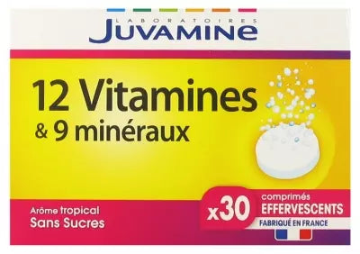 Juvamine 12 Vitamins & 9 Minerals 30 Effervescent Tablets Is A Food Supplement Based On Vitamins And Minerals, With Sweeteners. Vitamins C, B2, B3, B6, B9, Iron And Magnesium Contribute To Reduce Temporary Tiredness. Tropical Flavour. Sugars Free. Made In France