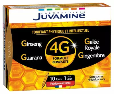 Juvamine 4G Ginseng Royal Jelly Guarana Ginger 10 Phials Is A Food Supplement, Physical And Intellectual Toning. Ginseng Is Known To Bring Tone And Energy. It Contributes To Physical And Mental Well